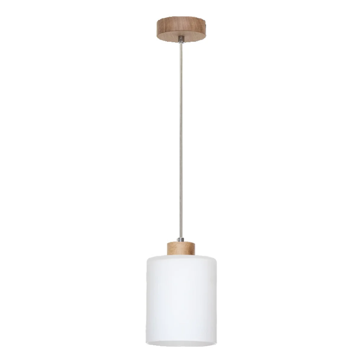 The opal cylinder-shaped lampshade illuminates the room with pleasant blurred light.