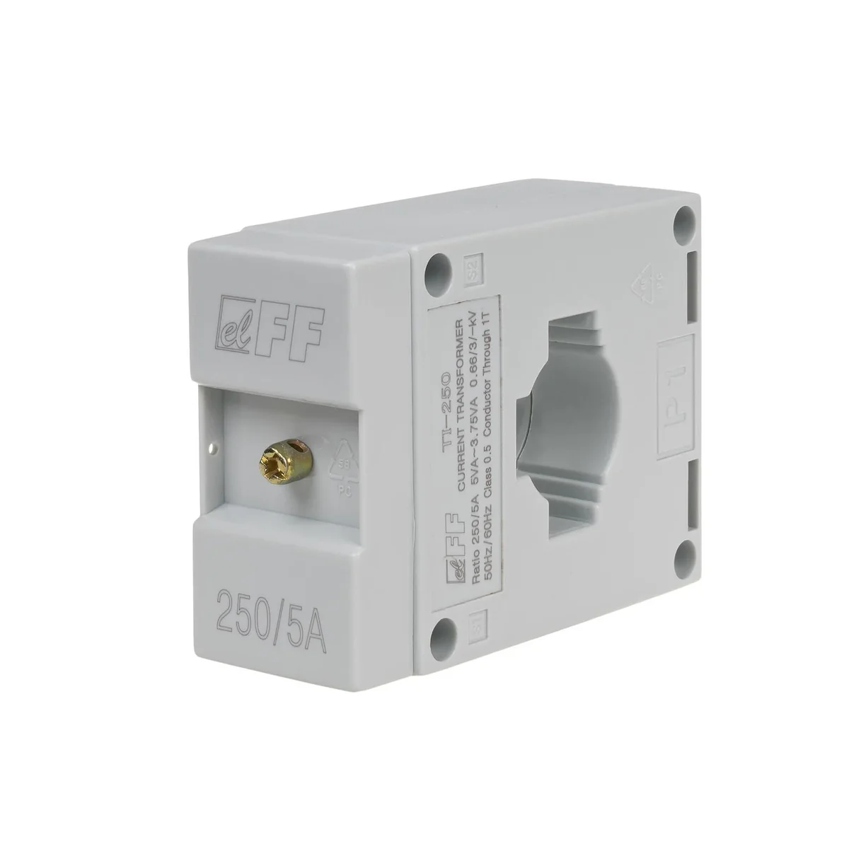 Current transformer 250/5A. The current transformer is used to proportionally change high currents to lower values, adapted to the measuring ranges of control and measuring devices.