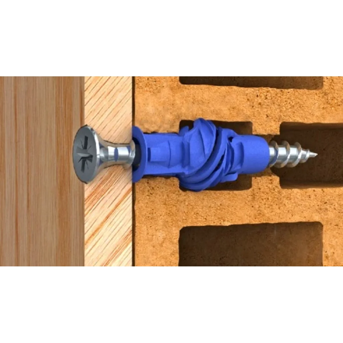 The unique internal structure facilitates stable screw guidance. Anti-rotation wings enhance the anchor's grip on a wide range of substrates, including soft masonry and plasterboard. Ribs with a shape that strengthens the adhesion of the pin to the hole. The dividing line of the T-shirt is designed to obtain the largest possible contact surface after screwing the T-shirt in substrates with voids and plasterboard. The unique four-way expansion allows application on any type of substrate. Solid construction ensures durability once installed.