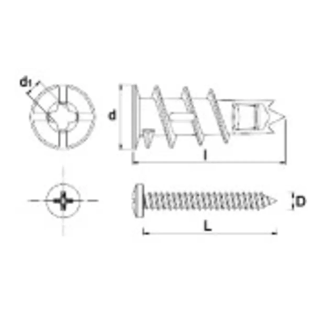 The collar prevents the fastener from being accidentally pulled through the drywall during installation. Can be used in a single or double plasterboard. The short size is ideal for dry finished walls. Very durable fiberglass material guarantees quick installation. Installation with a screwdriver or screwdriver. Recommended screw diameter: 3.5 - 4.2 mm. For use only with the screw included in the set. Recommended for use in fireproof boards. No drill required - just punch through the paper layer and tighten. Perfect for use with a manual or pneumatic screwdriver. To be used only in a set with a screw.