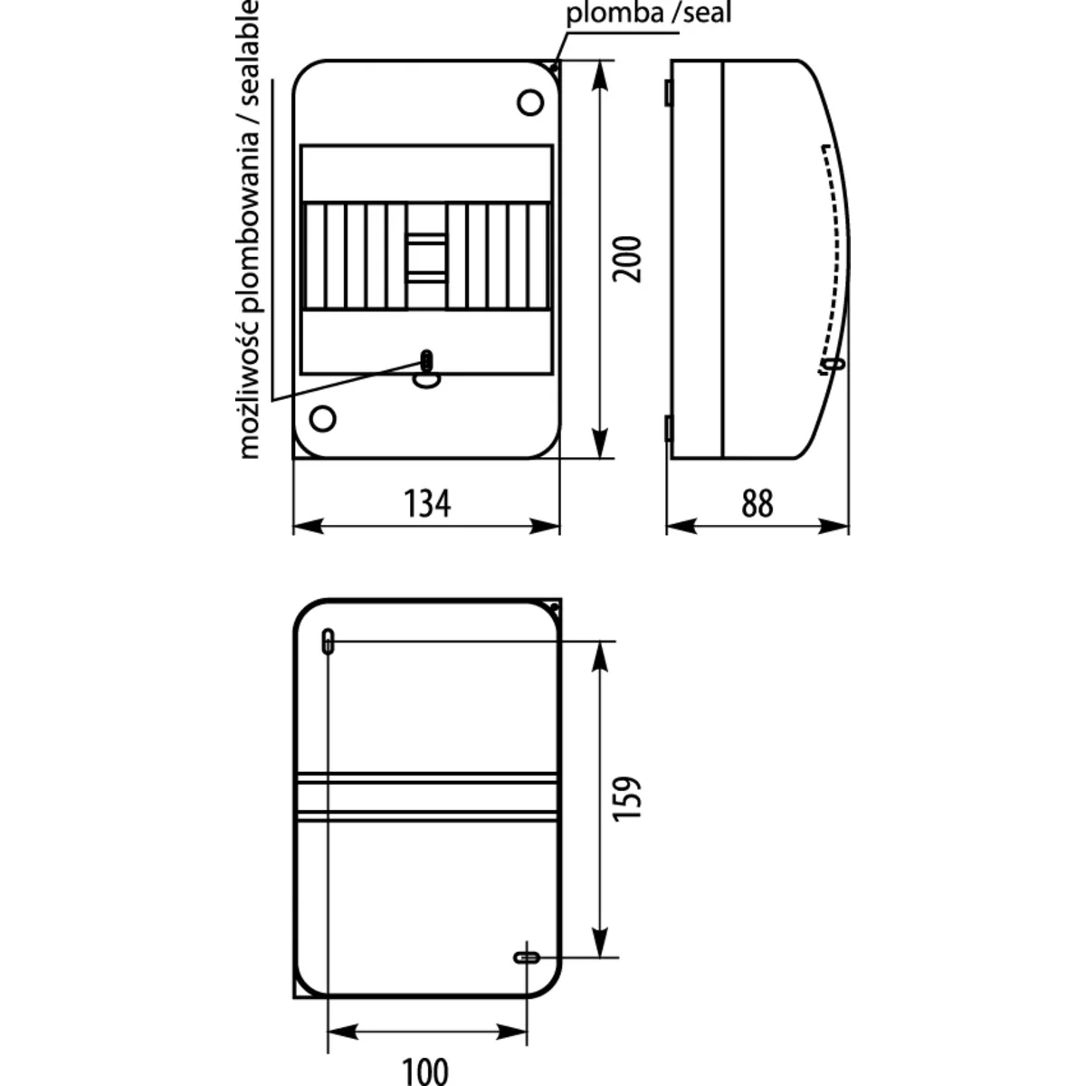 Switchboards are made of high-quality plastic. They are adapted for indoor use. The switchgears have a closed box casing and are suitable for sealing. In the side parts of the housing there are embossments for easy insertion of cables or installation pipes. Switchboards are provided with descriptive labels. They also have N+PE terminal strips. The mounting element in the switchgear is the TH 35/7, 5 (Eurorail) bracket, which allows the installation of overcurrent protection devices, residual current devices and other electrical devices. According to the applicable standards, switchgears should be placed on fire-retardant walls by appropriately qualified persons