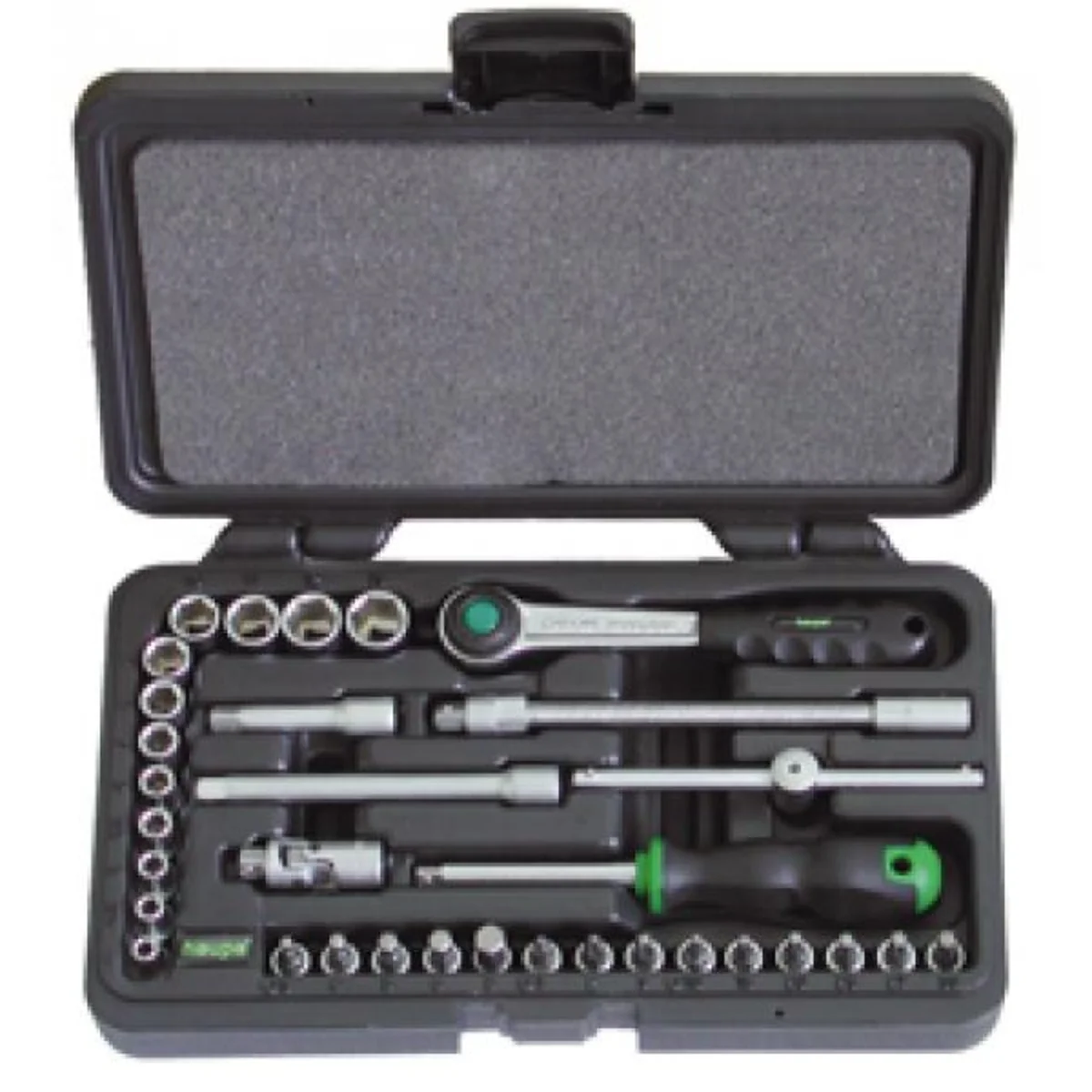 Chrome vanadium steel socket wrench set, professional quality, safety tested, black plastic case, 1/4 plug”.< /div>