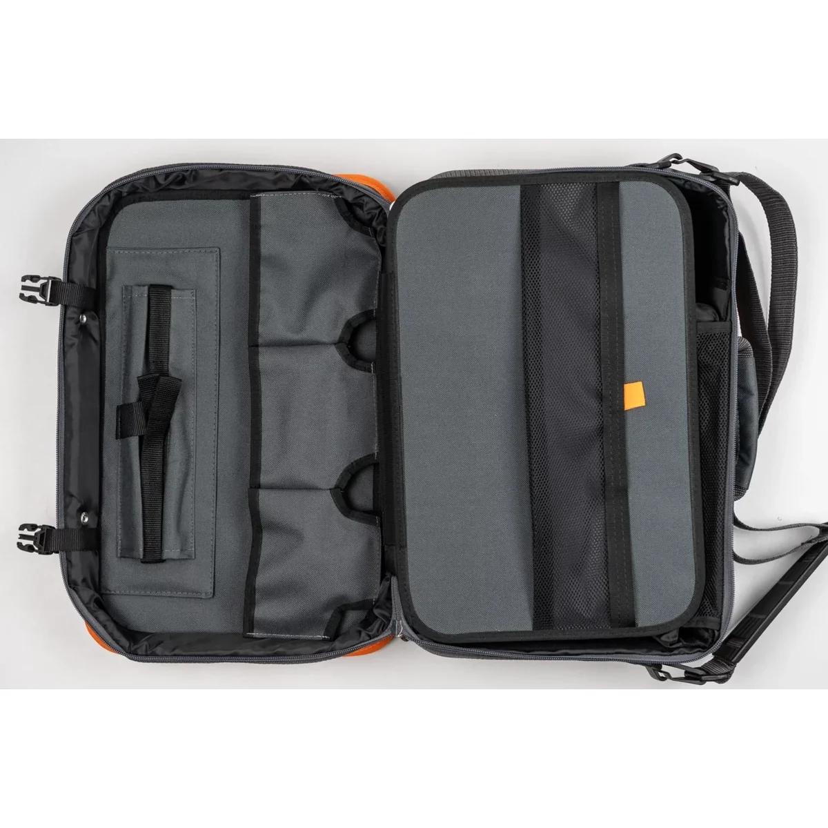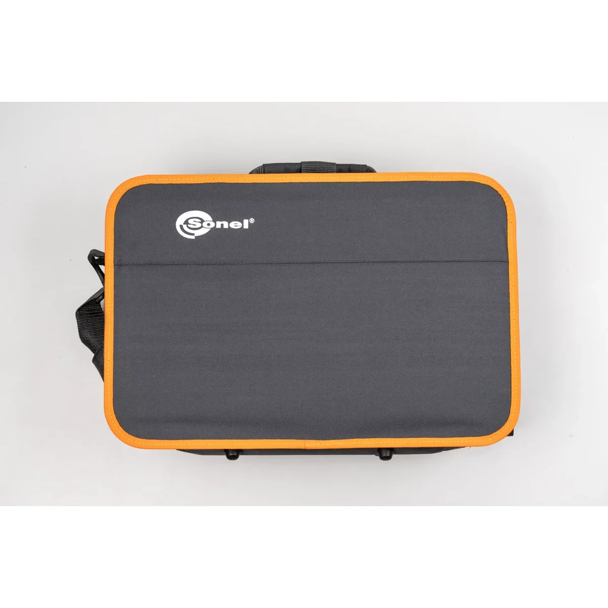 Diseñado para almacenar y transportar el medidor con accesorios. Dispone de dos compartimentos principales, dos bolsillos cerrados con cremalleras y dos bolsillos cerrados con el cierre tipo velcro, un bolsillo especial para documentos y un inserto para guardar carretes con cables de medición. El fondo de la funda está protegido contra el contacto con el suelo (cuatro pies). El juego se completa con un asa de transporte y una correa para colgar del hombro.