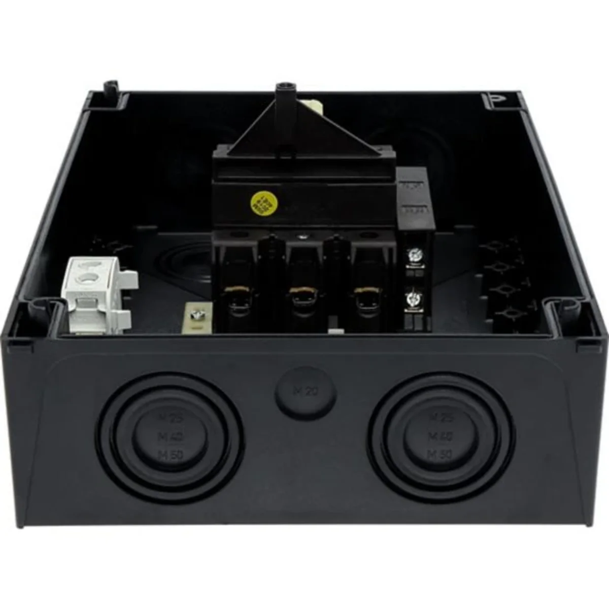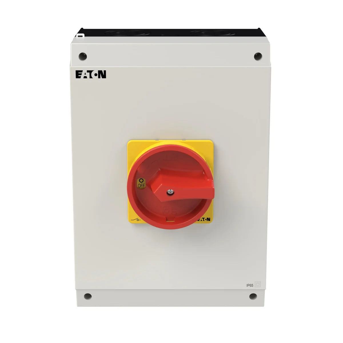 Interruptor On/Off In=63A P=37kW. Con pomo rojo-amarillo con bloqueo por candado según IEC/EN 60204-1, VDE 0113, parte 1. Bloqueable en posición 0