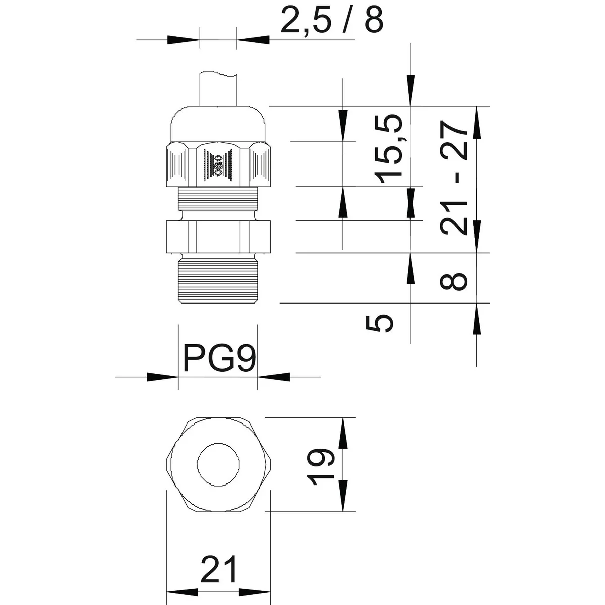 Prensaestopas duradero con rosca PG según DIN 40430 con un diseño de tuerca ciega con una gran área de sellado, alivio de tensión y protección antitorsión que garantiza una alta estanqueidad. Anillo de sellado de caucho de cloropreno/nitrilo, nervaduras de sellado pulverizadas, no requiere anillo de sellado de rosca, homologación VDE 0619, grado de protección IP68 a 5 bar/1 h.