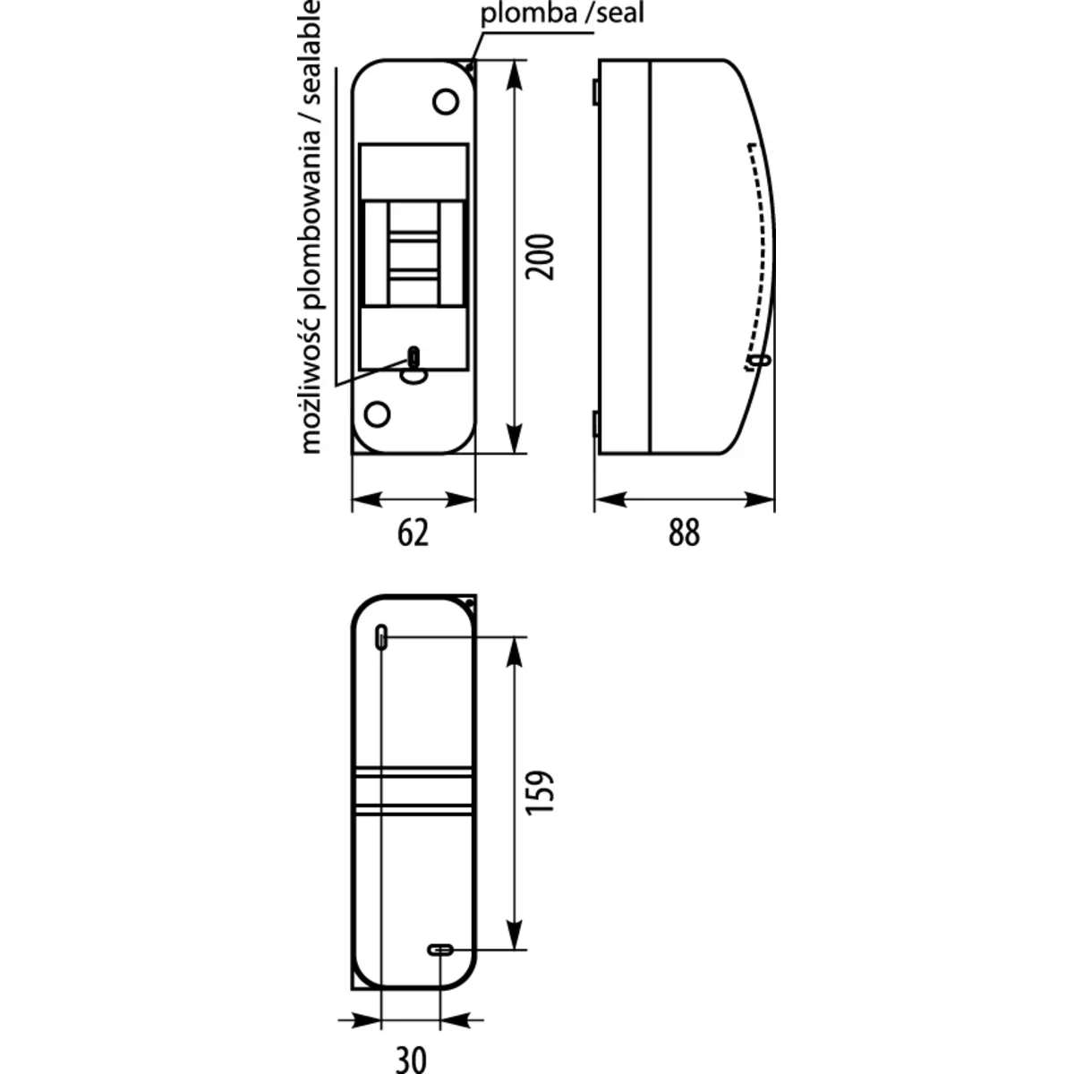 Los cuadros de distribución están fabricados de plástico de alta calidad. Son aptos para uso en interiores. Los cuadros tienen una carcasa de caja cerrada y son aptos para el sellado. Las partes laterales de la carcasa tienen relieves para facilitar la introducción de cables o tubos de instalación. Los cuadros están equipados con etiquetas descriptivas. También disponen de regletas de bornes N+PE. El elemento de montaje en el cuadro es el soporte TH 35/7, 5 (Eurorail), que permite la instalación de protección contra sobrecorriente, disyuntores de corriente residual y otros dispositivos eléctricos. De acuerdo con las normas aplicables, los cuadros de distribución deben ser colocados sobre paredes ignífugas por parte de personas debidamente cualificadas.