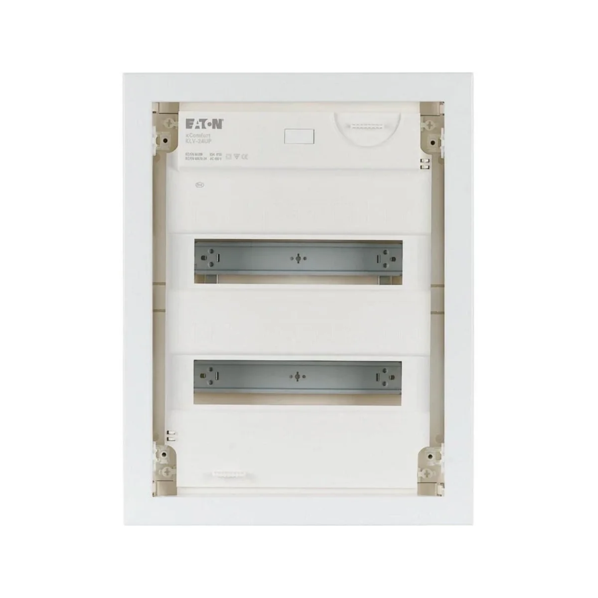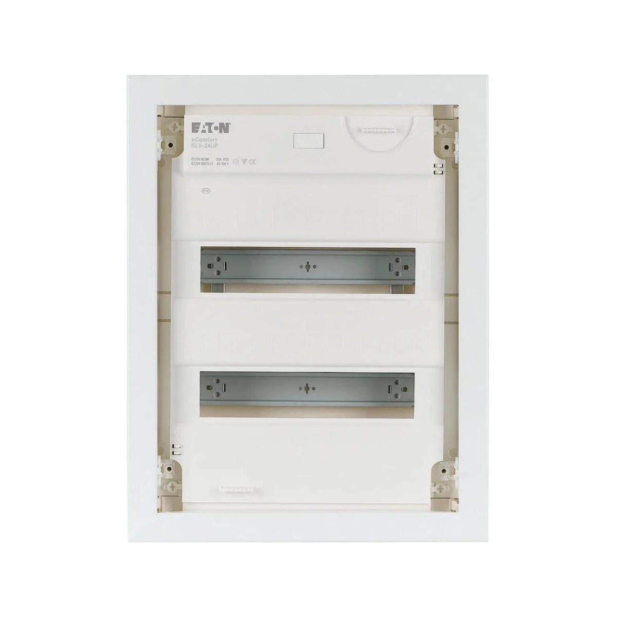 Cuadro eléctrico KLV-24UPS-SF, metálico empotrado con puertas macizas, es un elemento de la red eléctrica, contiene dispositivos y componentes utilizados para: conectar, interrumpir, controlar, proteger, medir y regular circuitos eléctricos, motores y mecanismos. Los cuadros de distribución de la serie KLV tienen una construcción estable de casete empotrado con nivel de burbuja integrado y se pueden montar en paredes de ladrillo y yeso. El kit de aparamenta incluye regletas de bornes N/PE. Toda la serie KLV cumple con las normas IEC/EN 60670-24 e IEC/EN 62208 e IEC/EN 61439-3.