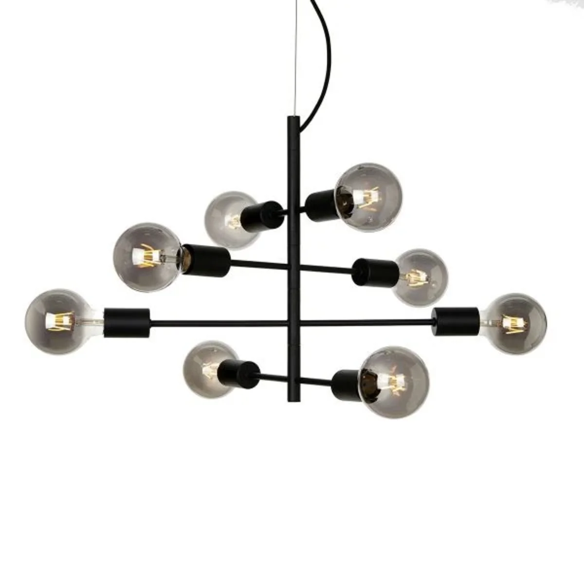 Una moderna lámpara Portel de acero en color negro con ocho puntos de luz.