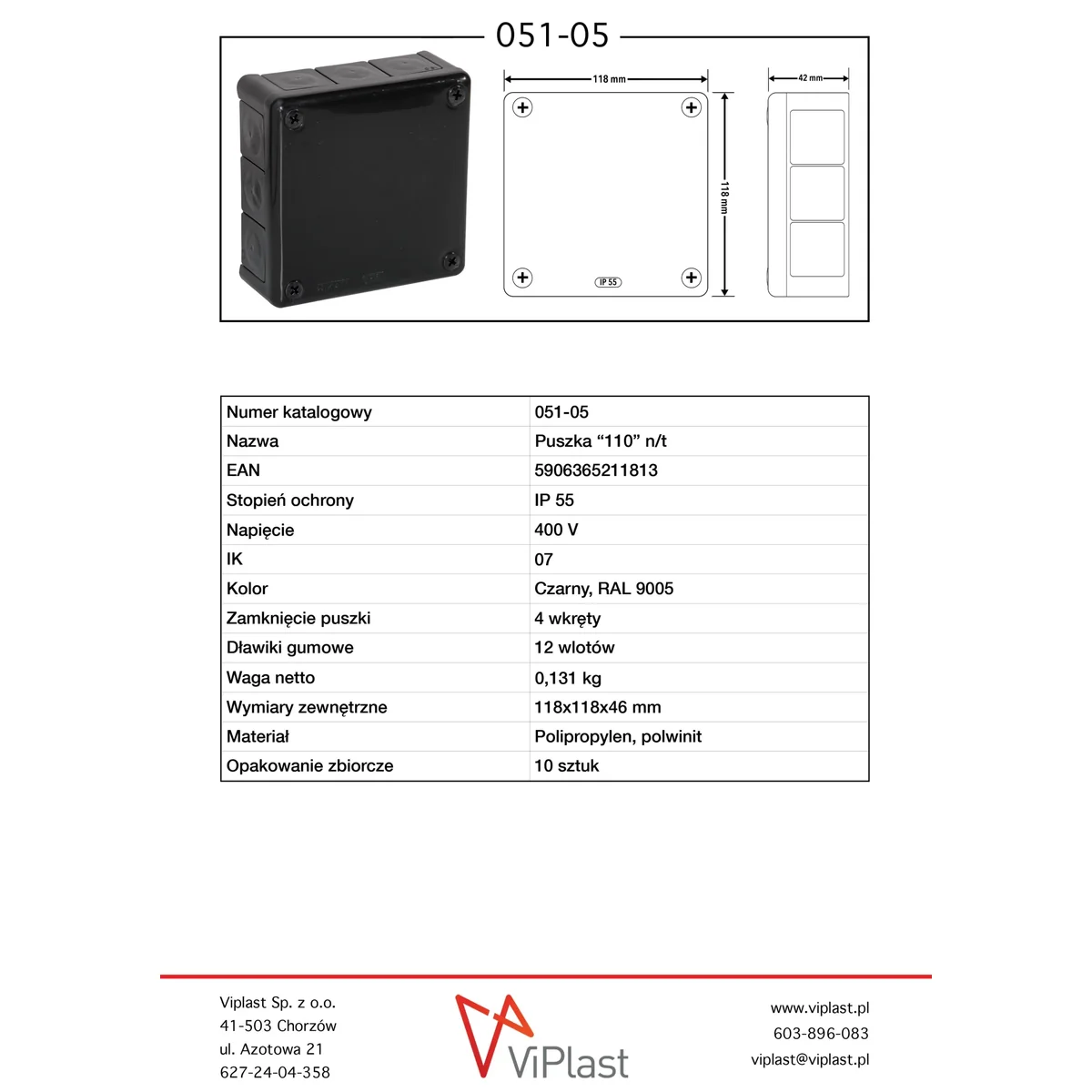 Caja de superficie "110", tamaño 118x118x46mm, con protección IP55, 12 entradas con prensaestopas de goma (sin rosca). Está equipado con una tapa con 4 tornillos. En negro.