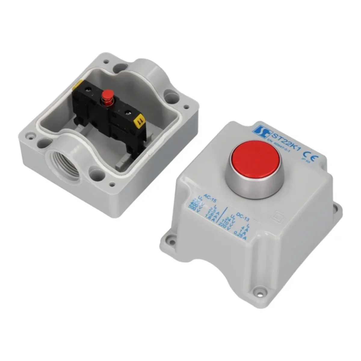 Caja de control de un solo orificio con botón STOP. Botón con botón forrado de color rojo (KC). ST22K1\02-1