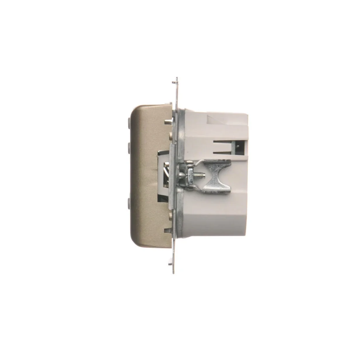 Controlador de temperatura con display y sensor de temperatura interno de la serie SIMON 54, oro mate, metalizado. Estaba hecho de plástico. La tensión nominal es de 230V. Fijación con garras o tornillos. Con terminales de tornillo.