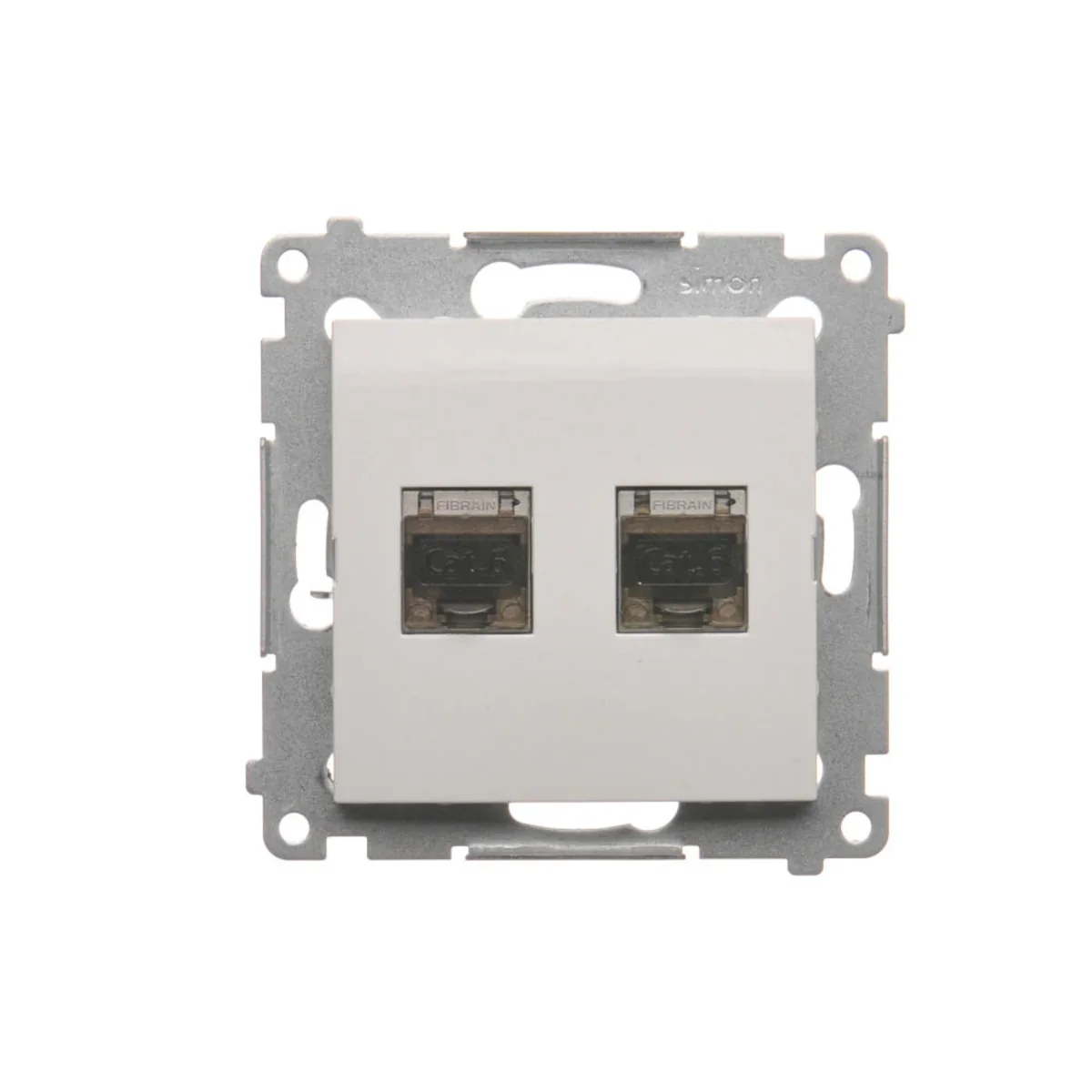 Toma ordenadordoble blindaje RJ45 categoría 6, con guardapolvo, serie SIMON 54. Hecho de plástico. Con abrazadera perforadora de aislamiento.
