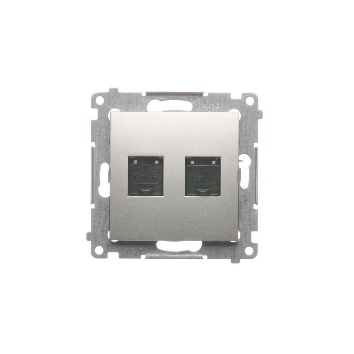 Toma ordenador, doble RJ45, categoría 6, con guardapolvo, serie SIMON 54. Hecho de plástico. Con abrazadera perforadora de aislamiento.