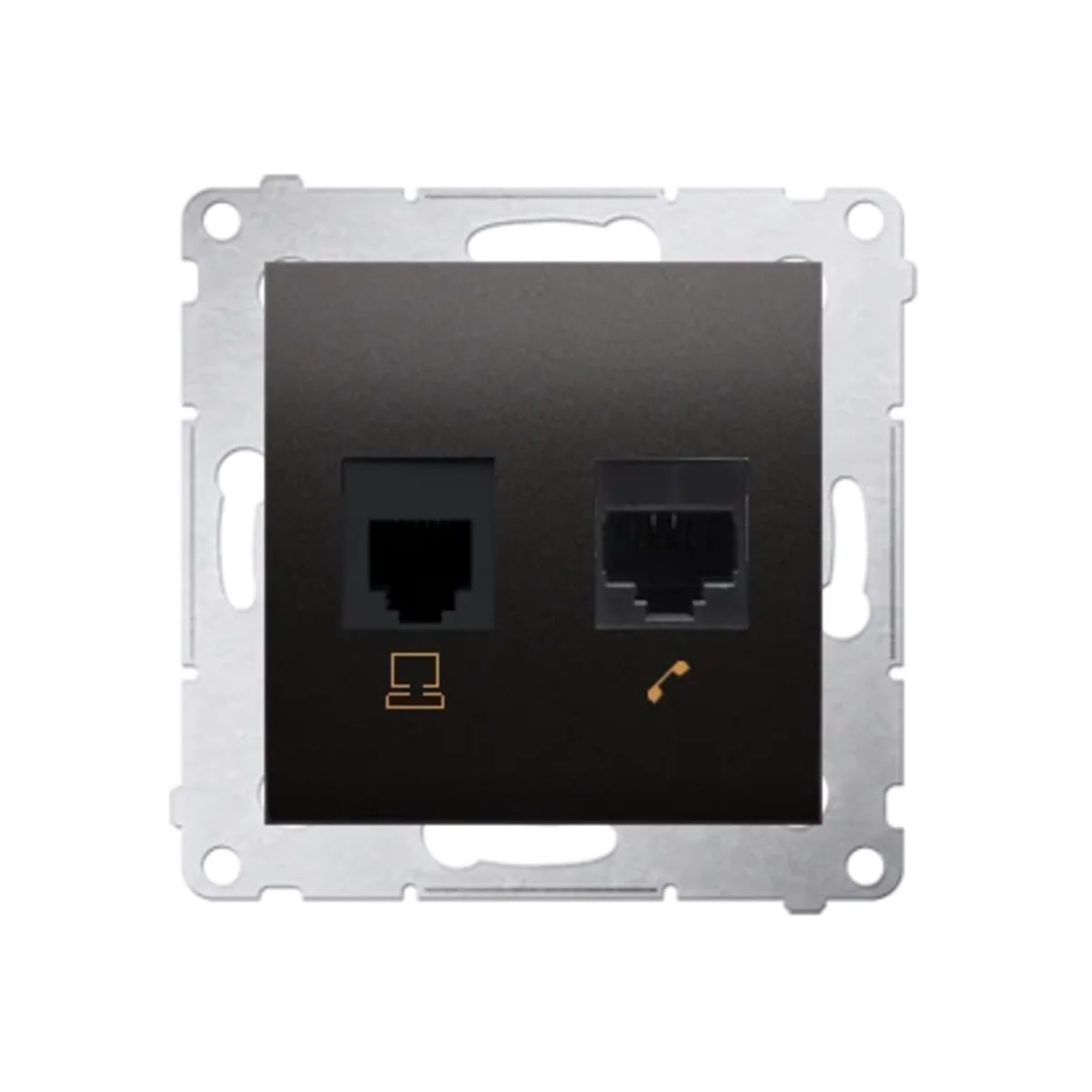 Toma ordenadorRJ45 categoría 5e + teléfono RJ12, de la serie SIMON 54. Hecho de plástico. Con abrazadera que perfora el aislamiento.