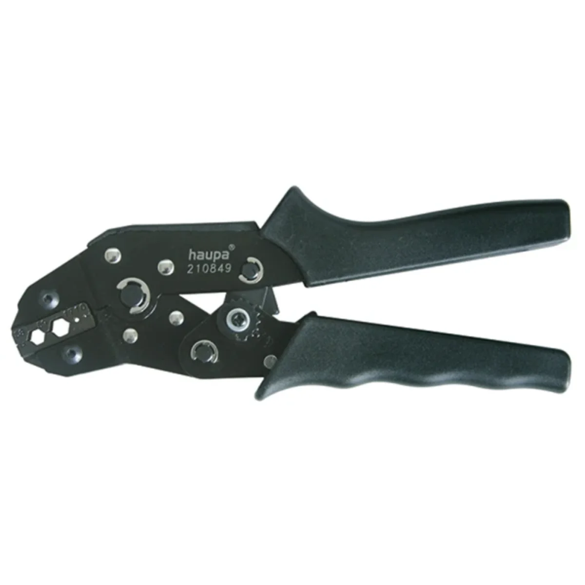 Alicates para engarzar conectores enchufables (Koax, BNC y TNC), modelo ligero, forma manejable con una curvatura de la cabeza del 20%, bloqueo forzado