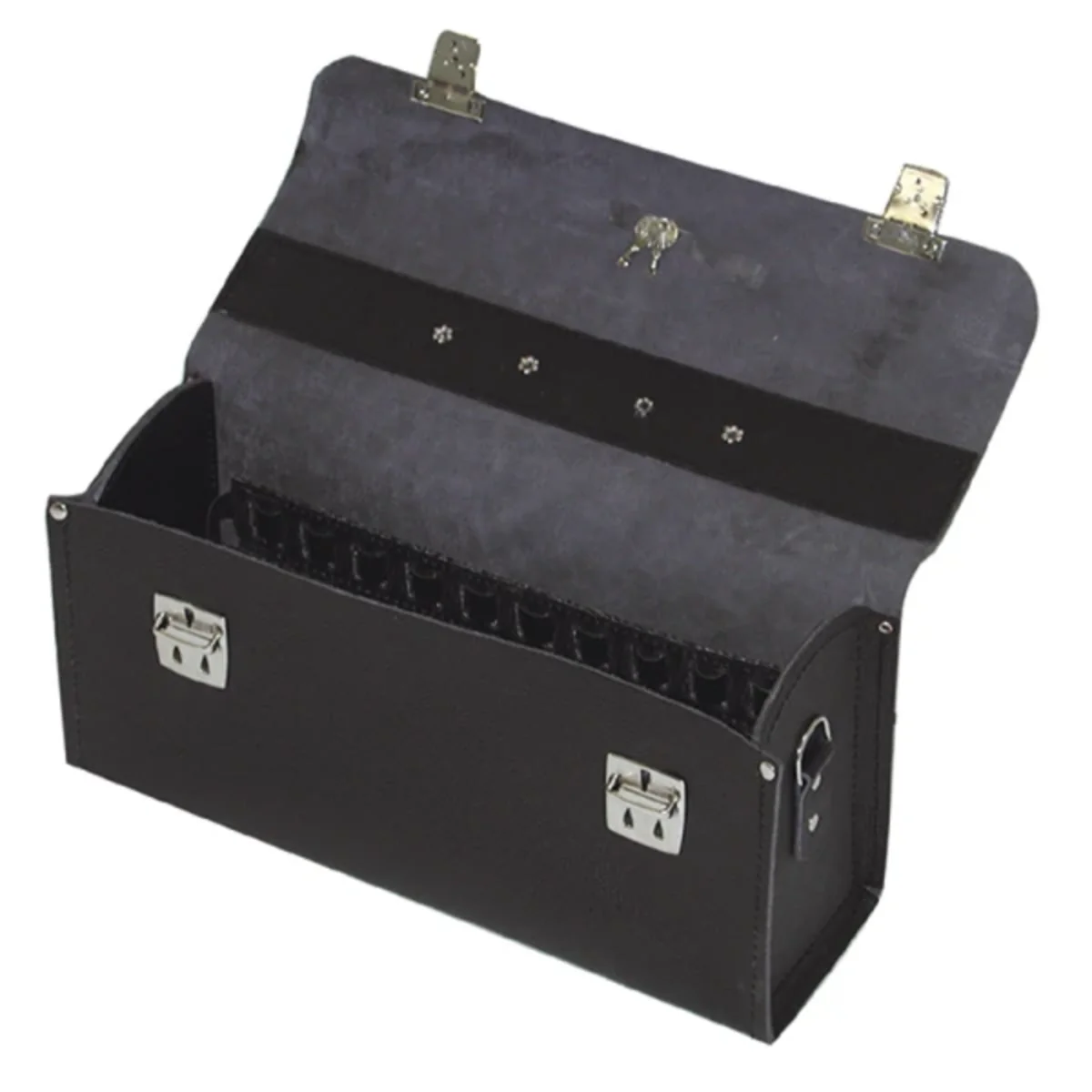 Maletín de herramientas "Tradición" y "Fan" de piel de vacuno negra, sujeta con 2 correas, con presillas para herramientas.