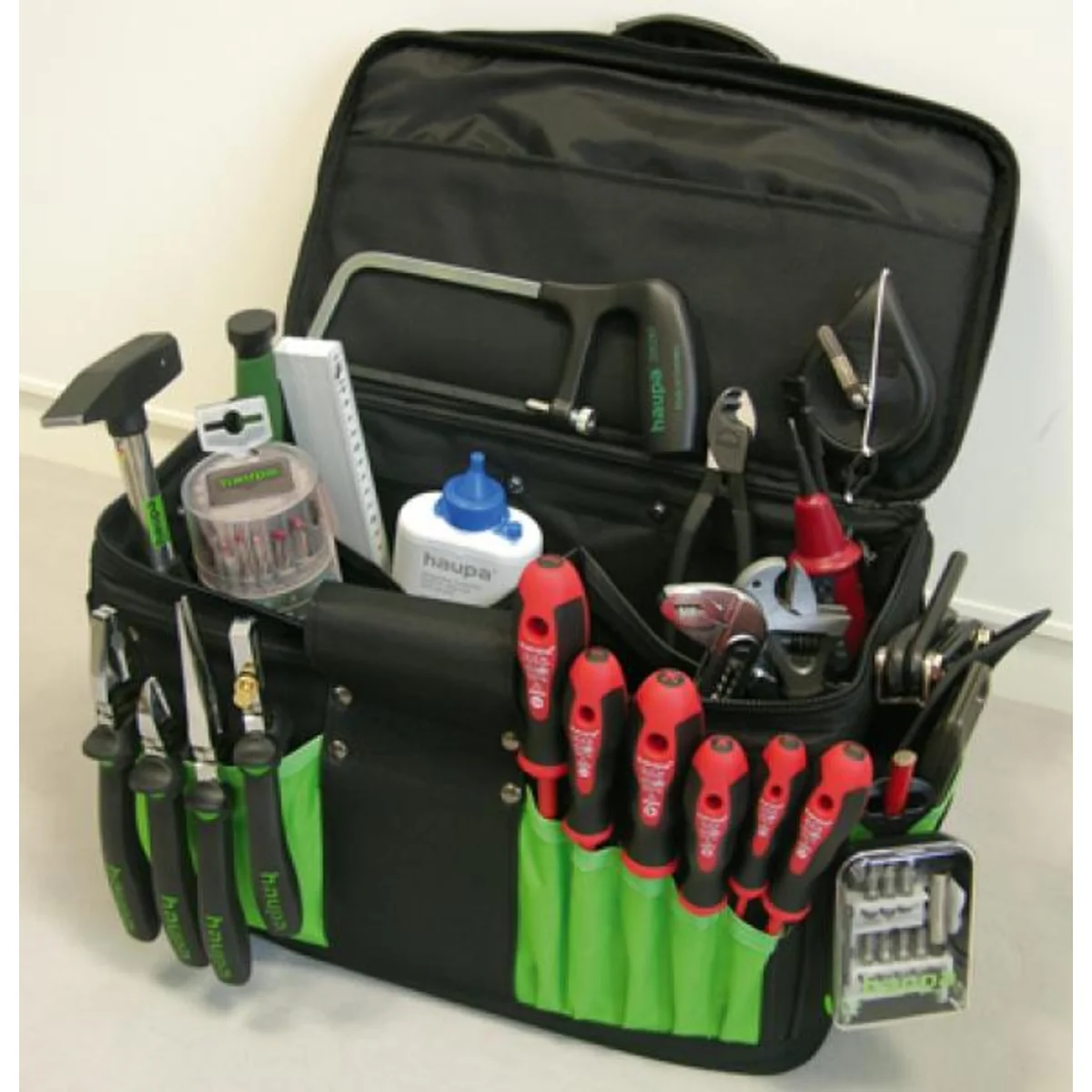 Contenido:• Destornillador de electricista 2K VDE, 2,5 x 75, 4 x 100, 5,5 x 125 y 6,5 x 150 mm• Destornillador Phillips 2K VDE, PH, tamaños 1 y 2• Alicate universal 2K, 180 mm• Alicate cortacables 2C, 160 mm• Alicate telefónico recto 2C, 200 mm• Alicate ajustable 2C, 240 mm• Alicate pelacables 2C, 160 mm• Caja de puntas HAUPA, 17 piezas.• Indicador de tensión "Básico" • Juego de llaves Allen de 7 piezas.• Ajustable llave con trinquete • Polvo para marcar - azul • Cordón para marcar enrollado • Lápiz de carpintero • Martillo de cerrajero 300 g • Cuchillo de montaje • Sierra de bolsillo 150 mm • Cortacables 160 mm • Maletín con taladros combinados • Nivel de burbuja para cuadros eléctricos • Medida plegable de fibra de vidrio 2 m