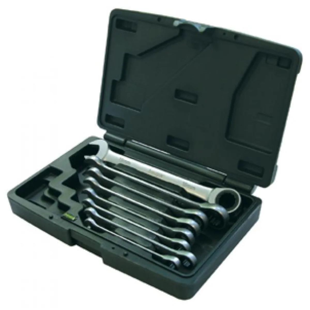 Conjunto de teclas planas: ojales con trinquete. Llaves combinadas con función de carraca de acero al cromo-vanadio, superficie exterior cromada, pulida, dentado fino, 72 dientes, ángulo de rotación 5°, lado del ojal 13° doblado, DIN 3113, ISO 3318, en caja de plástico.