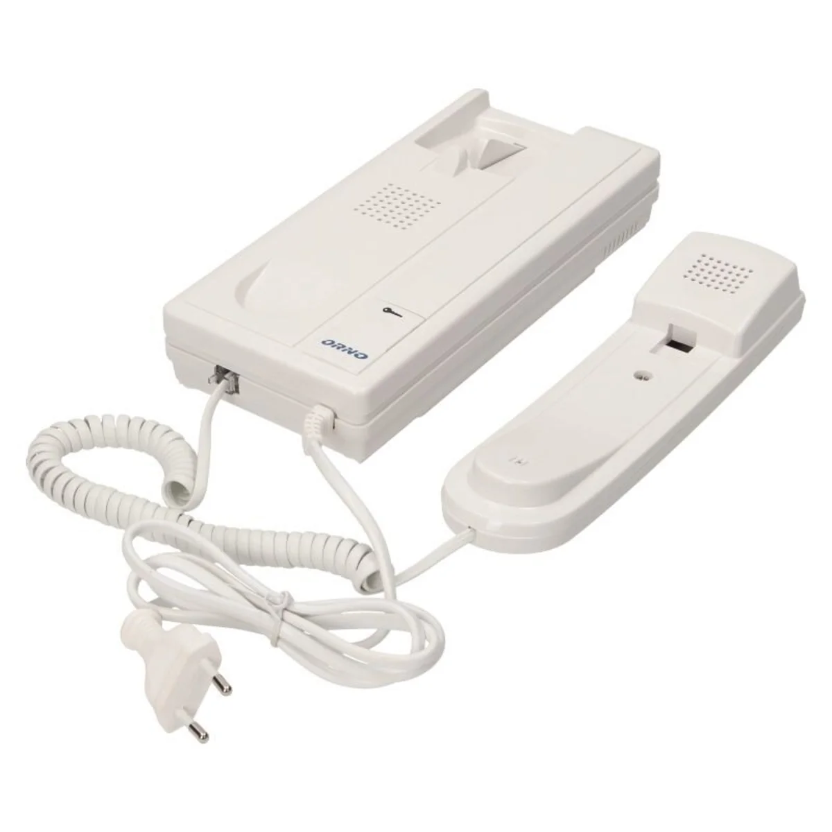 Intercomunicador Orno OR-DOM-RL-901UD < br />El uniphone Orno OR-DOM-RL-901UD tiene un diseño clásico. Está fabricado con material blanco de alta calidad, lo que garantiza una gran durabilidad. El intercomunicador funciona en sistema de dos hilos + 2 hilos que alimentan el cerradero eléctrico, lleva incorporado un alimentador (protegido por fusible) y un cable de alimentación.