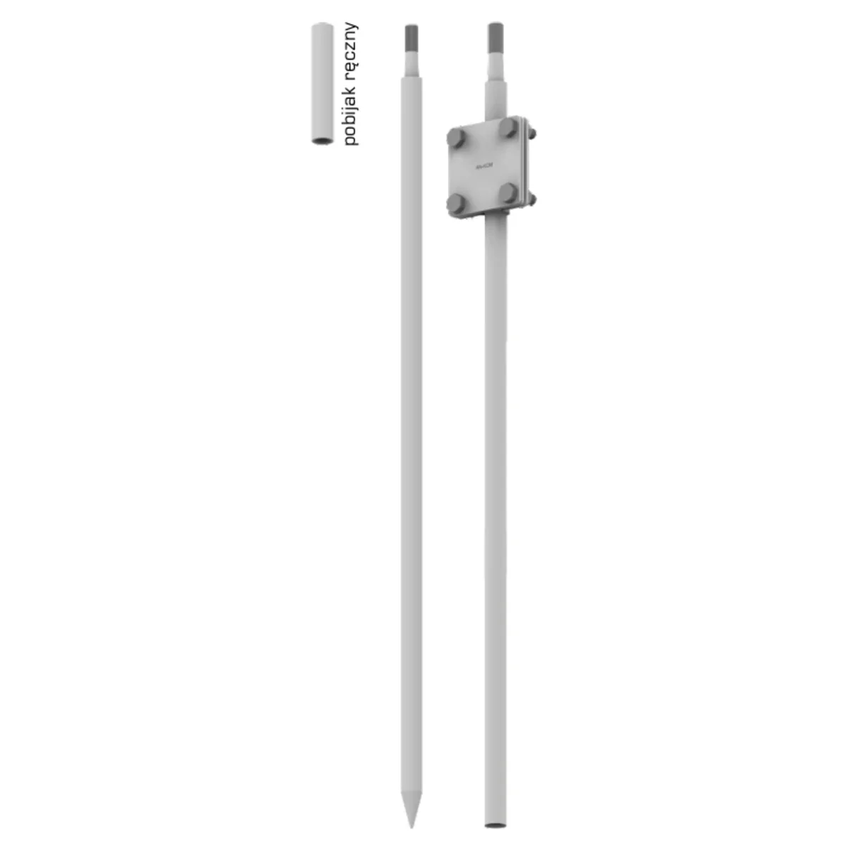 Electrodo de tierra completo, plegable, de 3 m de longitud. Consta de dos varillas (base, extensión) L = 1500 mm, un conector de tierra para conexión con un aro de hierro y un martillo. Es posible ampliar el electrodo de tierra utilizando la extensión AN-54Z.