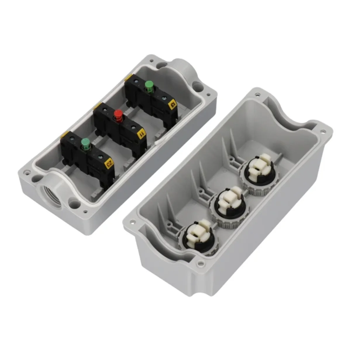 Boîte à boutons 3 trous avec boutons vert/rouge/vert IP65 ST22K3\02-1