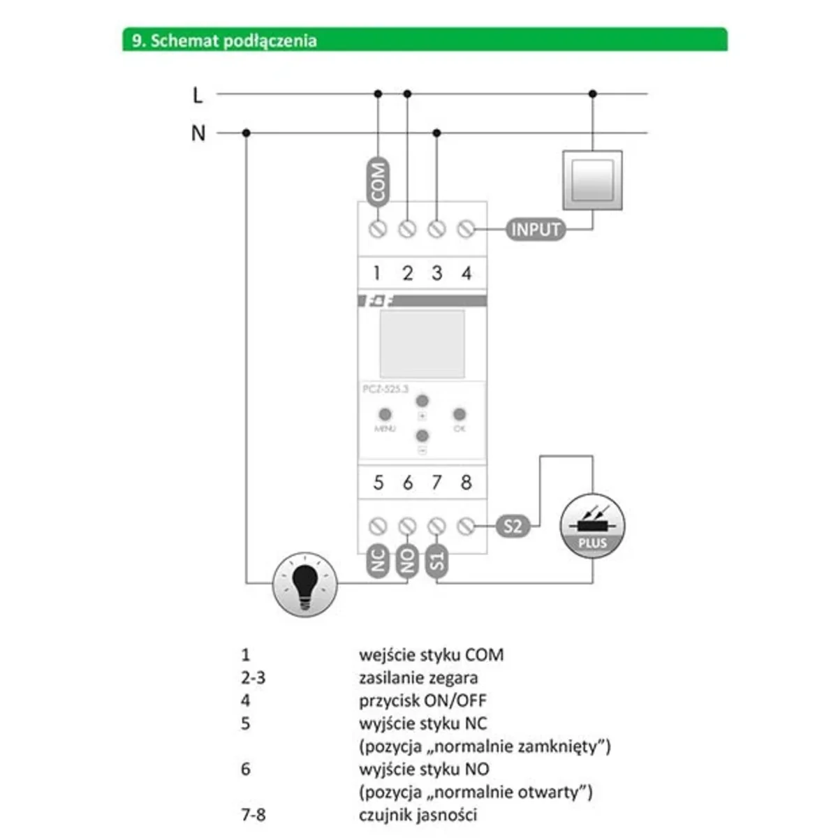 • Possibilité de connecter un bouton externe pour le programme de travail d'interruption temporaire et le contrôle manuel du fonctionnement du relais (la pause sera valable jusqu'au prochaine commutation résultant du cycle de travail automatique),