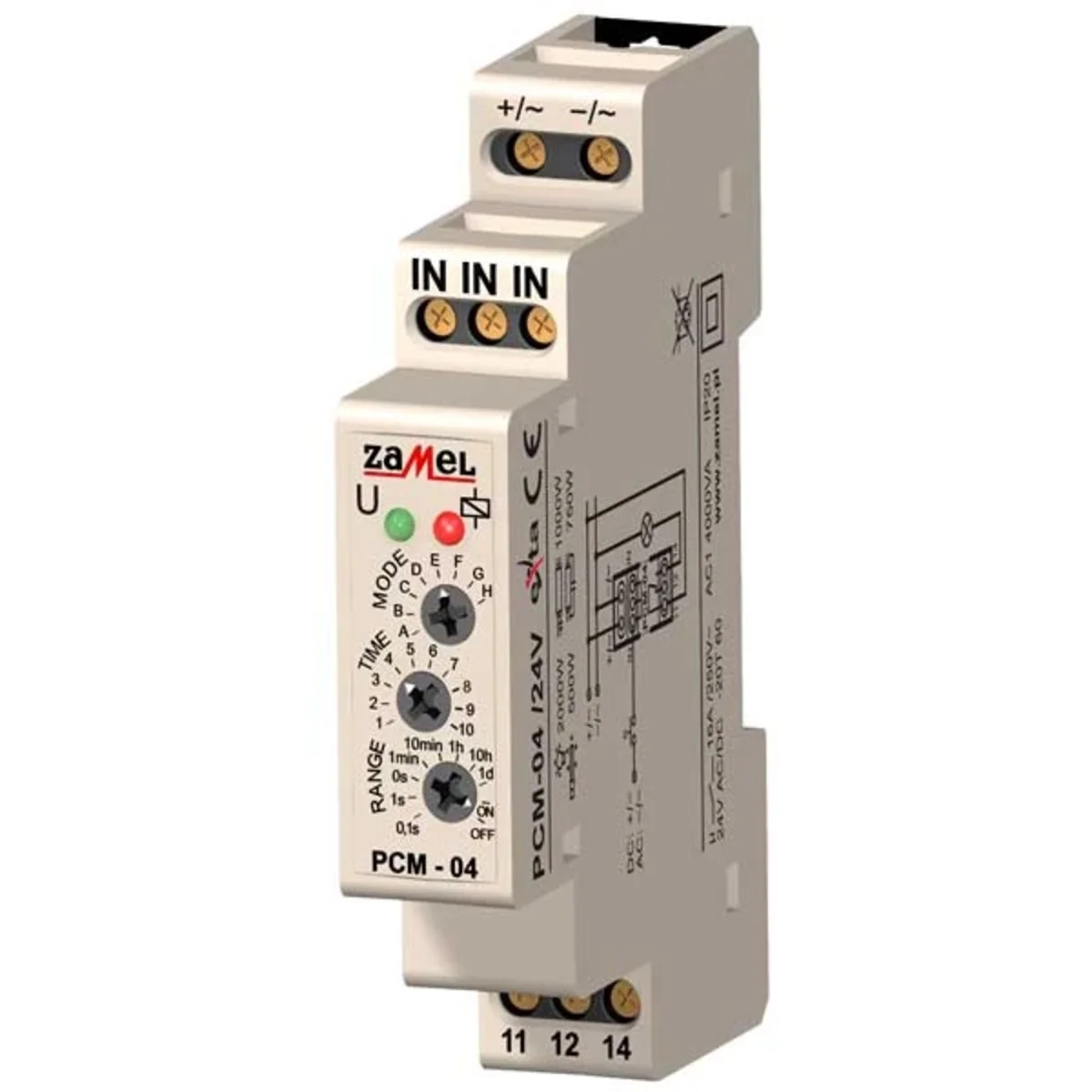 Le relais temporisé multifonctionnel PCM-04/24V est utilisé pour mettre en œuvre des fonctions de temps dans les systèmes d'automatisation et de contrôle. Il dispose de 10 modes de fonctionnement indépendants déclenchés par la tension d'alimentation ou une impulsion de déclenchement externe (provenant de la ligne L ou N). Il se caractérise par une très large gamme de réglages de l'heure et des fonctions d'allumage et d'extinction permanentes. Il est possible de changer de mode sans attendre la fin du cycle en cours.
