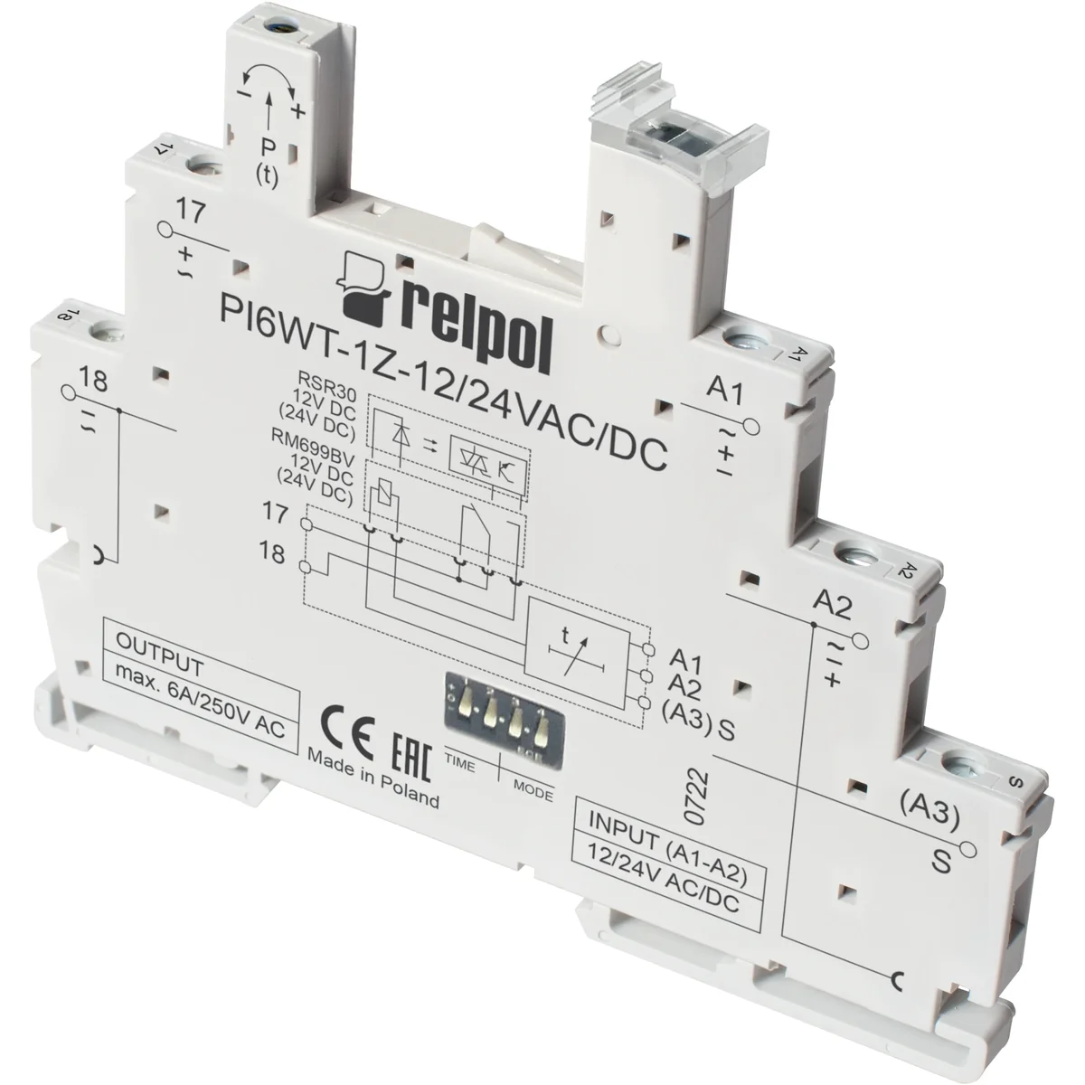 Relais temporisé multifonctionnel à profil étroit : 1 NO - un contact NO. Largeur 6,2 mm. Fonctions : E, Wu, Bi, Bp, R, Ws, Wa, Esa, B, OFF - arrêt permanent. Bornes à vis. Sortie (interchangeable - relais RM699BV, code "R") : contacts 1NO - bornes : (+)17 - (-)18 ; AC1 - 6A / 230V ; DC1 - 6 A / 24 V. Entrée - bornes : A1 - A2 - toute polarité ; contact de commande externe S - bornes : S(A3) - A1, tension d'alimentation Un - 24 V AC/DC. Dimensions : 98,5 x 6,2 x 85,5 mm. Montage sur rail 35 mm. Boîtier compact. IP 20.