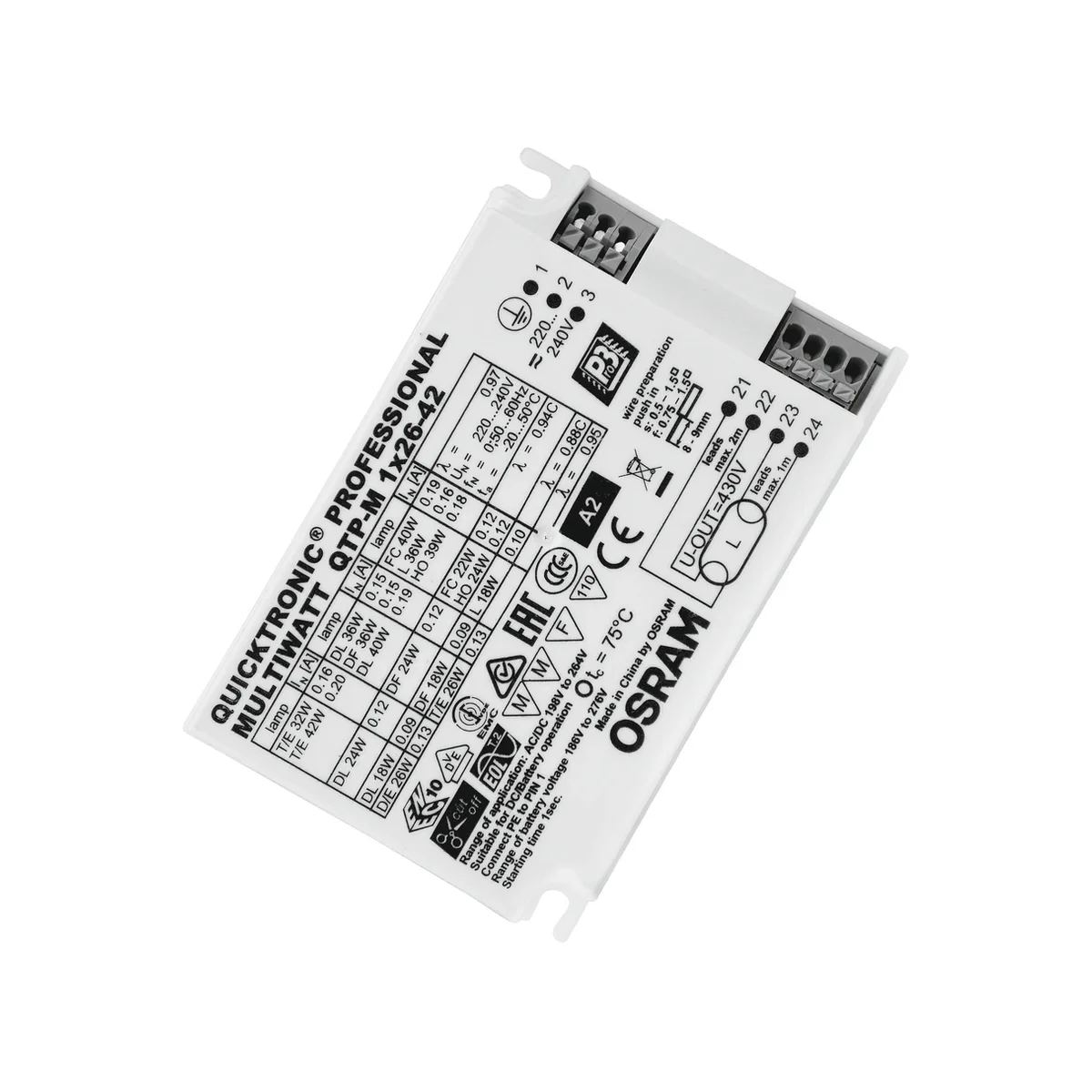 Ballast électronique QTP-M 1x26-42 1xD/E 26W, 1xDT/E26W, 1xDT/E 32W, 1xDT/E 42W, 1xDL 18W, 1xDF 18W, 1xDL 24W, 1xDF 24W, 1xDL 36W, 1xDF 36W, 1xDL 40W, 1 xL18W ( 26mm), 1xL 36W (26mm), 1xFC 22W, 1xFC40W, 1xFQ 24W, 1xFQ 39W. DANS,