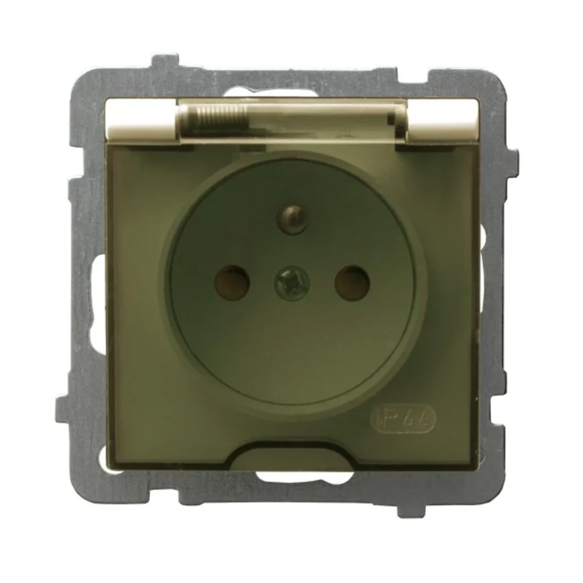 Prise hermétique équipée d'un volet, mise à la terre, avec obturateurs pour passages de courant. Un cadre doit être utilisé.