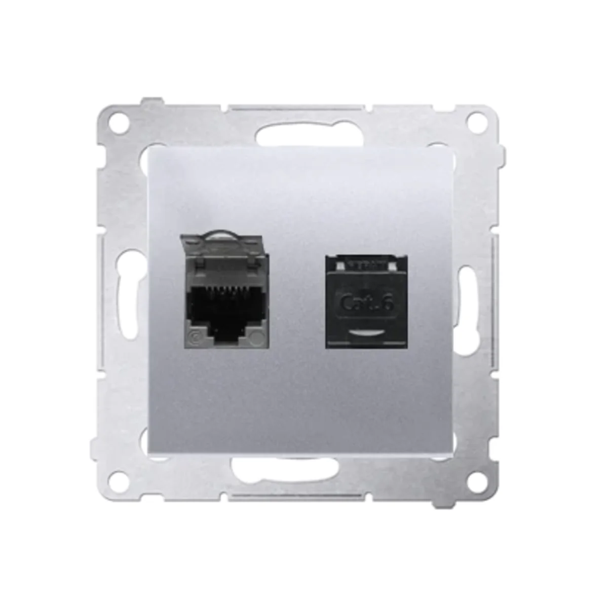 Double prise ordinateur RJ45, catégorie 6, avec cache anti-poussière, série SIMON 54. Fabriqué en plastique. Avec sertissage perforant.
