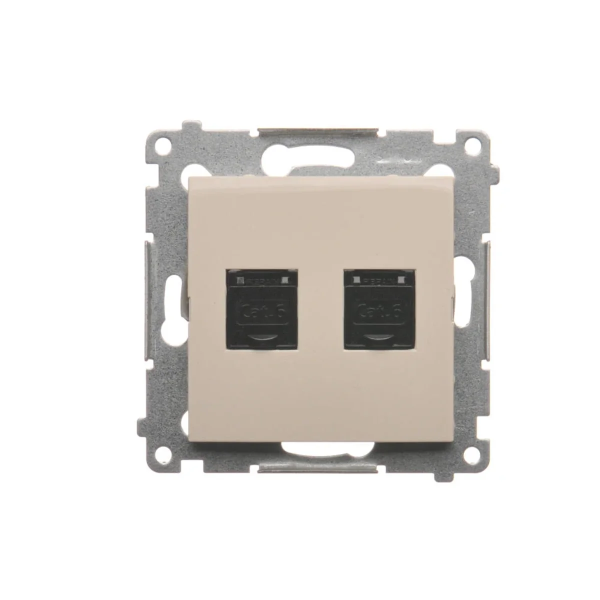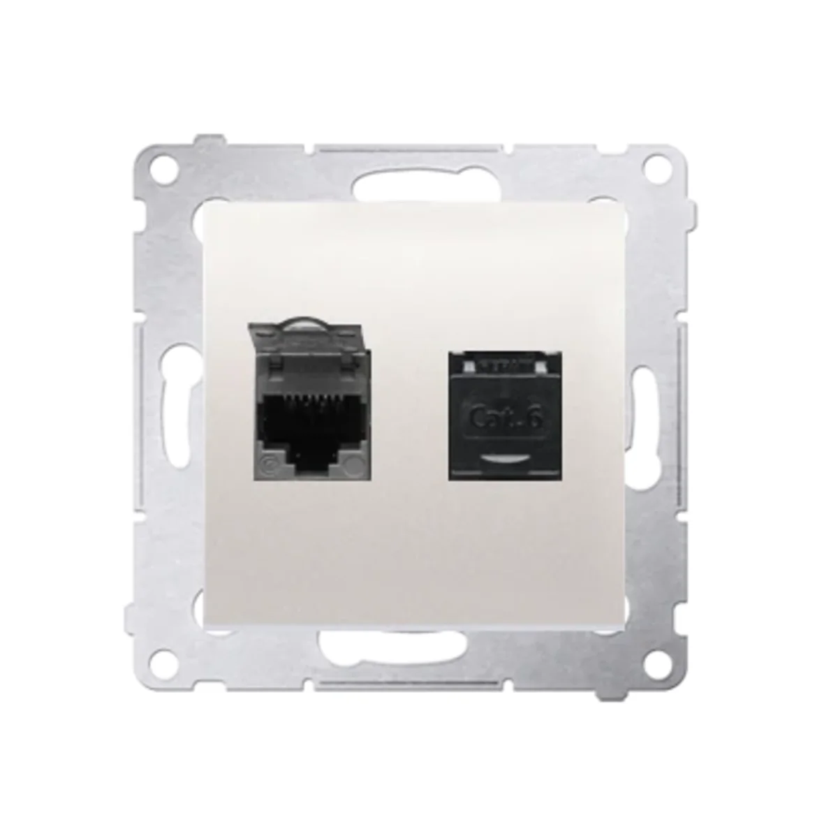 Double prise ordinateur RJ45, catégorie 6, avec cache anti-poussière, série SIMON 54. Fabriqué en plastique. Avec sertissage perforant.
