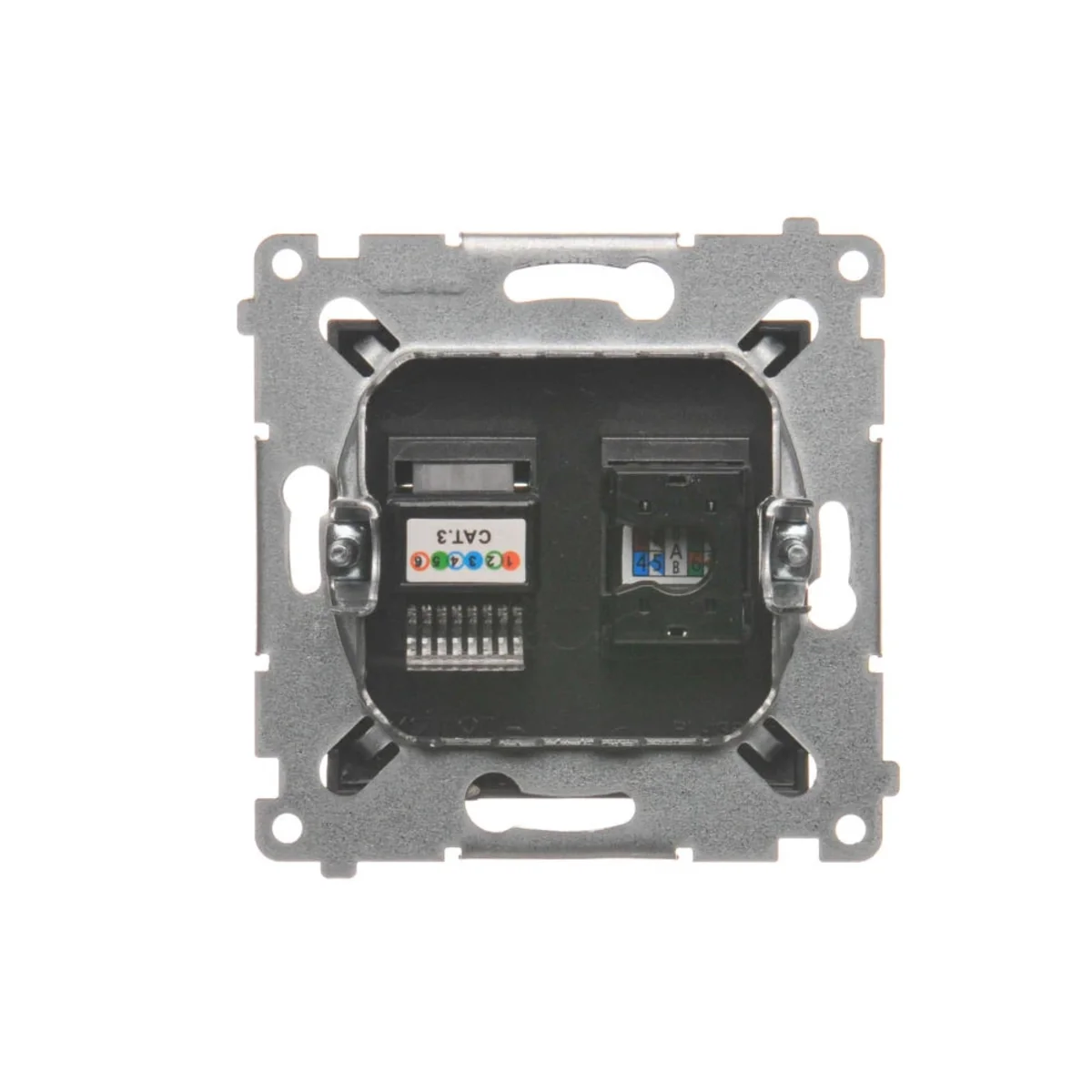 Prise informatique RJ45 catégorie 5e + téléphone RJ12, série SIMON 54. Fabriqué en plastique. Avec pince à perçage d'isolant.