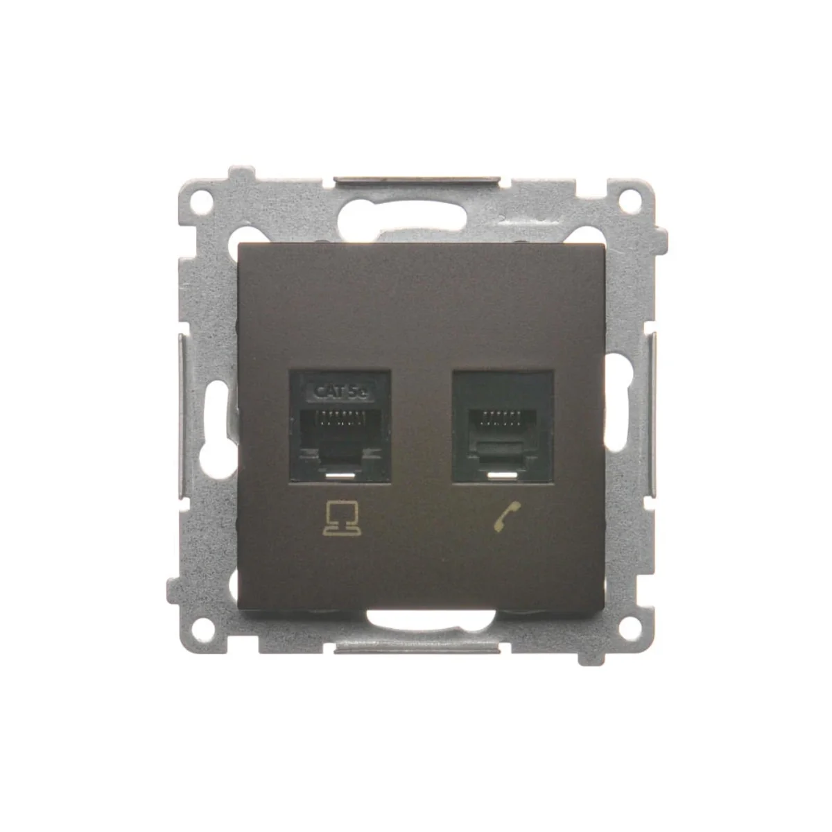 Prise informatique RJ45 catégorie 5e + téléphone RJ12, série SIMON 54. Fabriqué en plastique. Avec pince à perçage d'isolant.