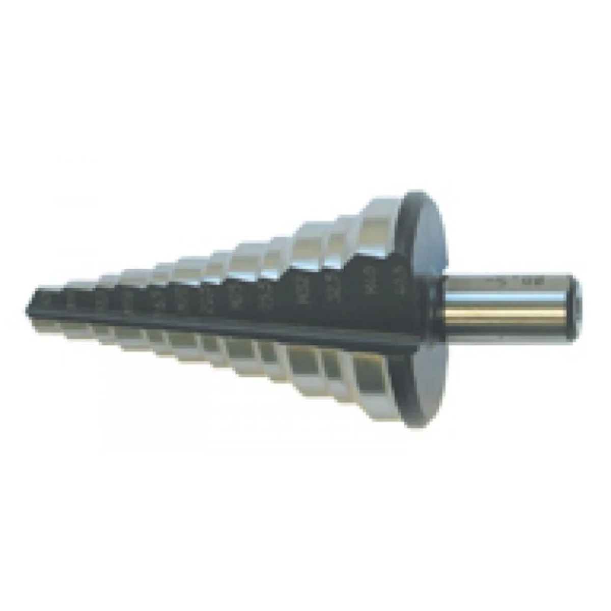 Foret étagé HSS pour trous débouchants et trous taraudés métriques, 6 diamètres de trous taraudés avec pas de 5 mm pour tôle jusqu'à max. 6 mm, pas de 3 mm avec 6 diamètres de trous traversants pour une épaisseur de matériau jusqu'à max. 6 mm.