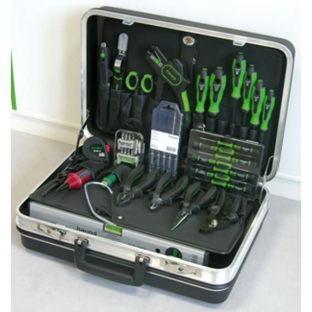 Contenu :• Tournevis d'électricien 2K, 2,5 x 75, 4 x 100, 4 x 125 et 5 x 150 mm• Tournevis Phillips 2K PH, tailles 1 et 2• Jeu de tournevis pour l'électronique, 7 pièces• 2K Pince, 180 mm• Pince coupante latérale 2K, 160 mm• Pince téléphonique 2K, 200 mm• Pince à dénuder avec lame à crochet ? 8 - 28 mm• Pince à dénuder 4 - 16 mm ?• Pince à dénuder automatique 0,2 - 6 mm ?• Coupe-câble• Cisailles utilitaires à manche souple 2K• PUK• Scie de poche HAUPA "Bit box", 17 pièces.• SDS plus 5- jeu de forets à la pièce • Niveau à bulle en métal léger de 400 mm • Ruban à mesurer de 3 m • Indicateur de tension « de base »