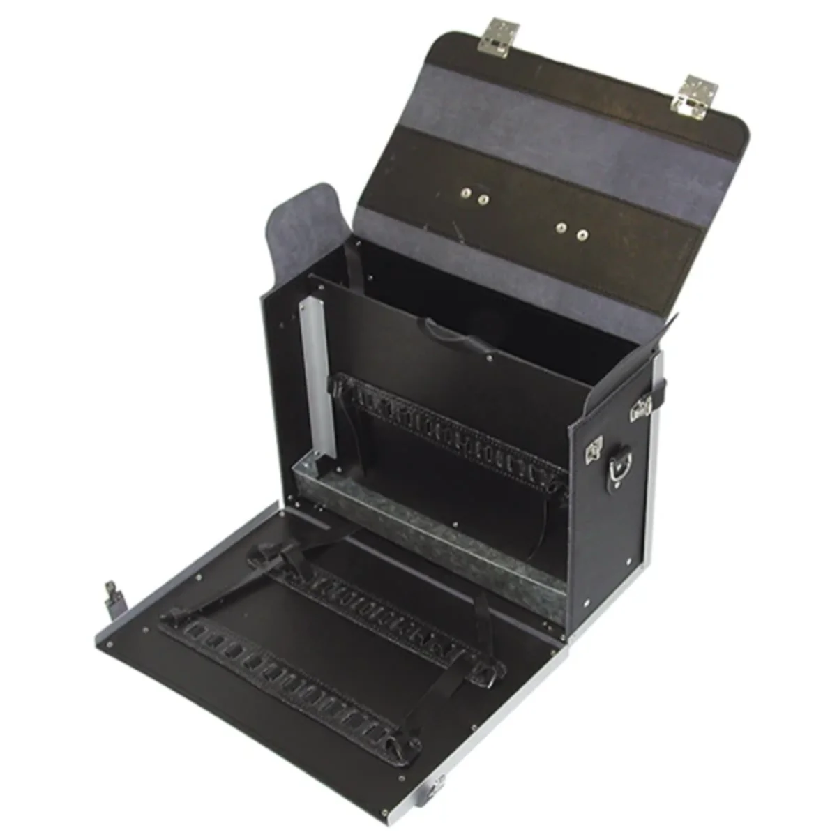 Mallette à outils “Comet“ en cuir de vachette noir, tous bords renforcés d'aluminium, fond en tôle galvanisée, fermeture latérale rivetée, convient pour attacher une bandoulière, avec ouverture partie avant et arrière, avec 2 serrures, avec paroi centrale amovible, toutes les parois avec de nombreux compartiments et porte-outils, sans bandoulière