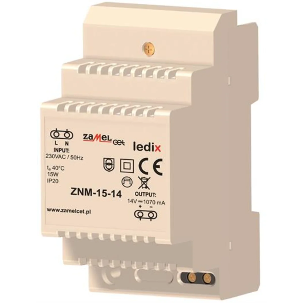 L'alimentation ZNM-15-14 est une alimentation à impulsions professionnelle avec stabilisation de tension 14 V DC. L'alimentation est conçue pour fonctionner avec les produits de la série LEDIX. L'appareil est réalisé dans un boîtier à 3 modules, destiné à être monté sur un rail TH-35. L'alimentation se caractérise par une très faible consommation d'énergie en veille, un rendement élevé de 79%, une grande stabilité de la tension de sortie et une fiabilité à long terme.