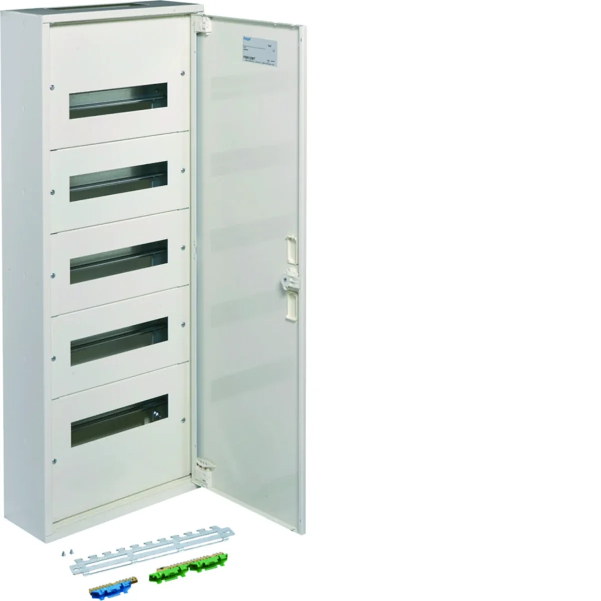 Appareillage complet en saillie avec portes, grille de montage, couvercles métalliques et un jeu de bornes à vis PE/N montées sur un support spécial, pour appareils jusqu'à 125 A,