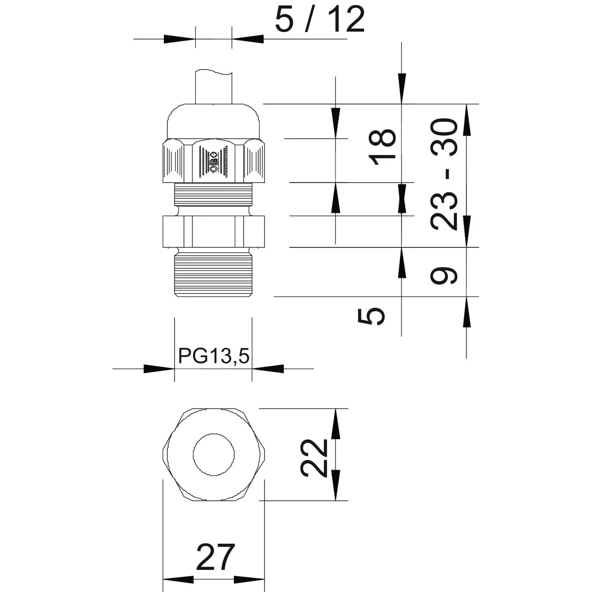Presse-étoupe robuste avec filetage PG selon DIN 40430 en forme d'écrou borgne avec grande surface d'étanchéité, décharge de traction et verrou tournant pour une étanchéité élevée. Bague d'étanchéité en caoutchouc chloroprène/nitrile, nervures d'étanchéité injectées, pas de bague d'étanchéité filetée nécessaire, homologuée VDE 0619, IP68 à 5 bar/1h.