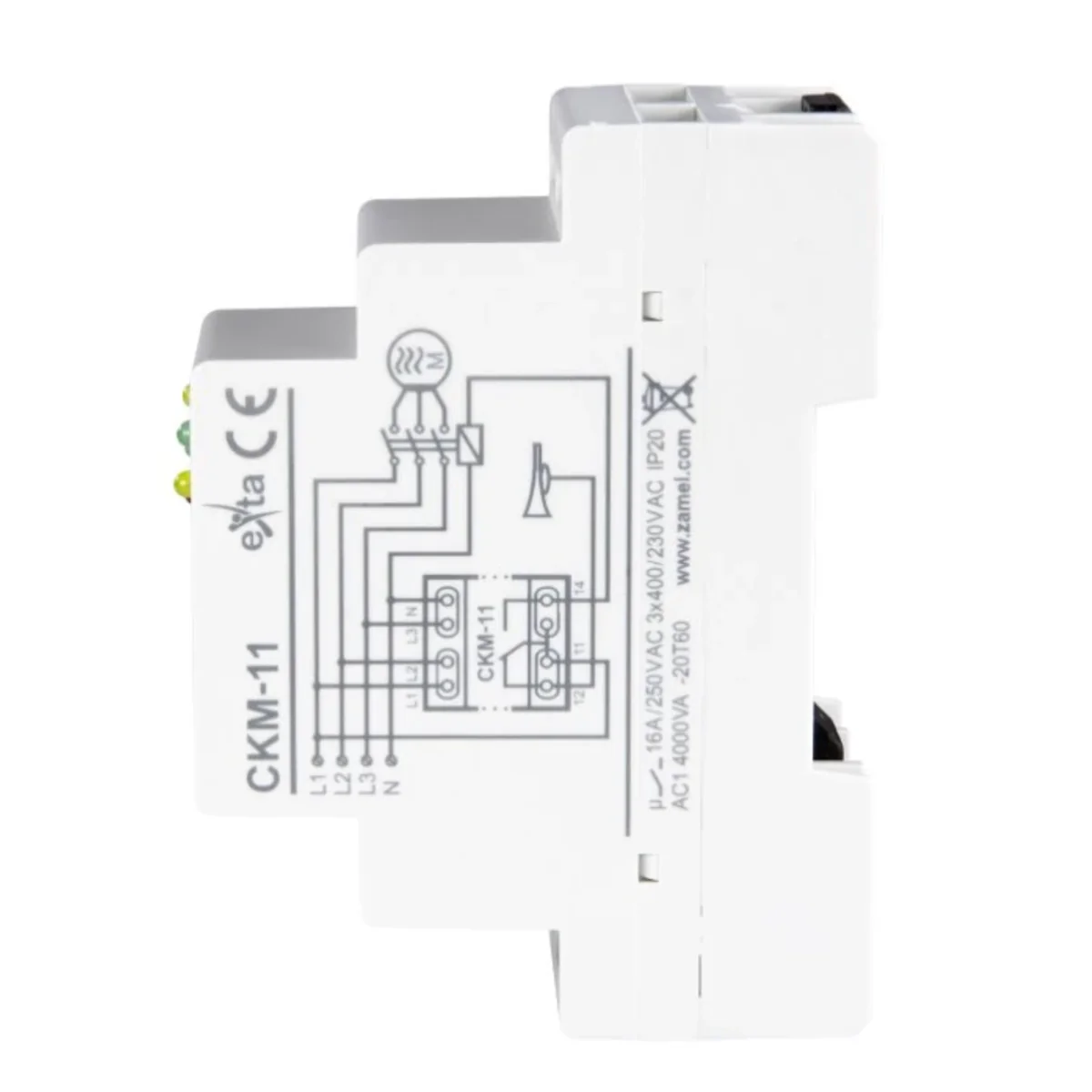 Il sensore di sequenza di fase CKM-11 viene utilizzato per proteggere i dispositivi alimentati da una rete trifase (ad esempio, motori) da danni in caso di perdita di tensione di fase, asimmetria della tensione di fase o sequenza di fase errata. La soglia di asimmetria è impostata in fabbrica a 55 V. Il sensore protegge anche dalle cadute di tensione simmetriche disabilitando il relè se la tensione su una qualsiasi fase scende al di sotto di 150 V (indipendentemente dal livello di asimmetria). Il dispositivo è alimentato da qualsiasi fase, il che significa che la tensione su una singola fase è sufficiente per la piena funzionalità. Un ritardo di spegnimento di 4 secondi e l'isteresi di tensione rendono il sensore resistente alle fluttuazioni di tensione a breve termine.