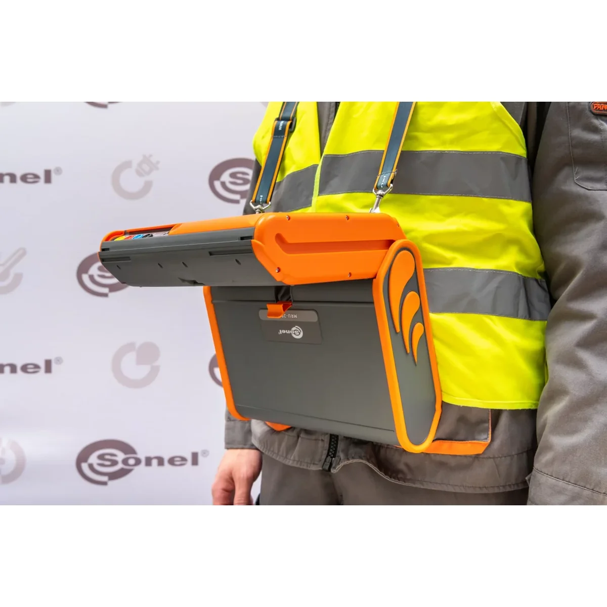 Le imbracature si adattano perfettamente ai contatori Sonel e sono dotate di moschettoni all'estremità. Grigio scuro con elementi arancioni.