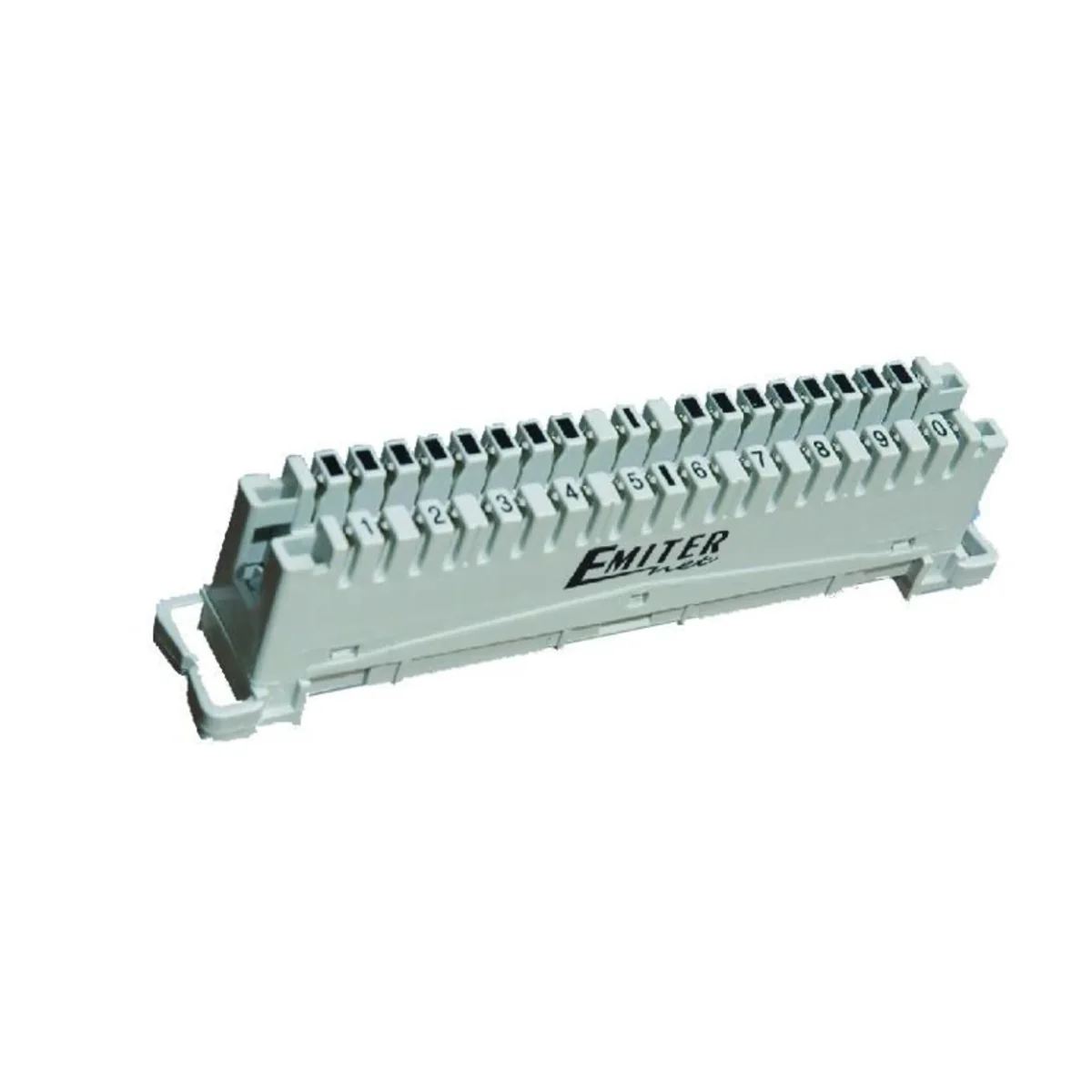 Connettore telefonico (connettore crossover) LSA, non separabile per 10 coppie. Non è necessario rimuovere l'isolamento dai cavi durante l'installazione. Le connessioni vengono effettuate utilizzando un coltello da toppa. Il connettore accetta fili con una sezione compresa tra 0,4 e 0,6 mm (è possibile collegare 2 fili a 1 terminale). Presenta i contrassegni dei terminali 1, 2, ... 0