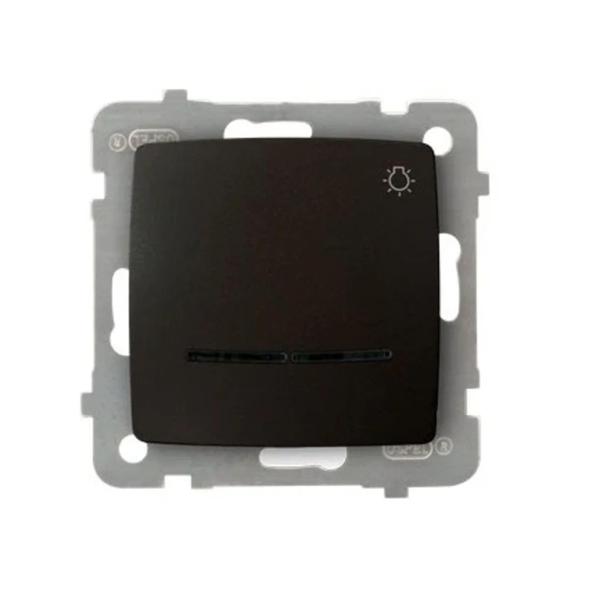 Interruttore "luce" senza normecon retroilluminazione, della serie Karo, del produttore Ospel. Numero di catalogo del prodotto it ŁP-5SS/M/40. In colore cioccolato metallizzato.