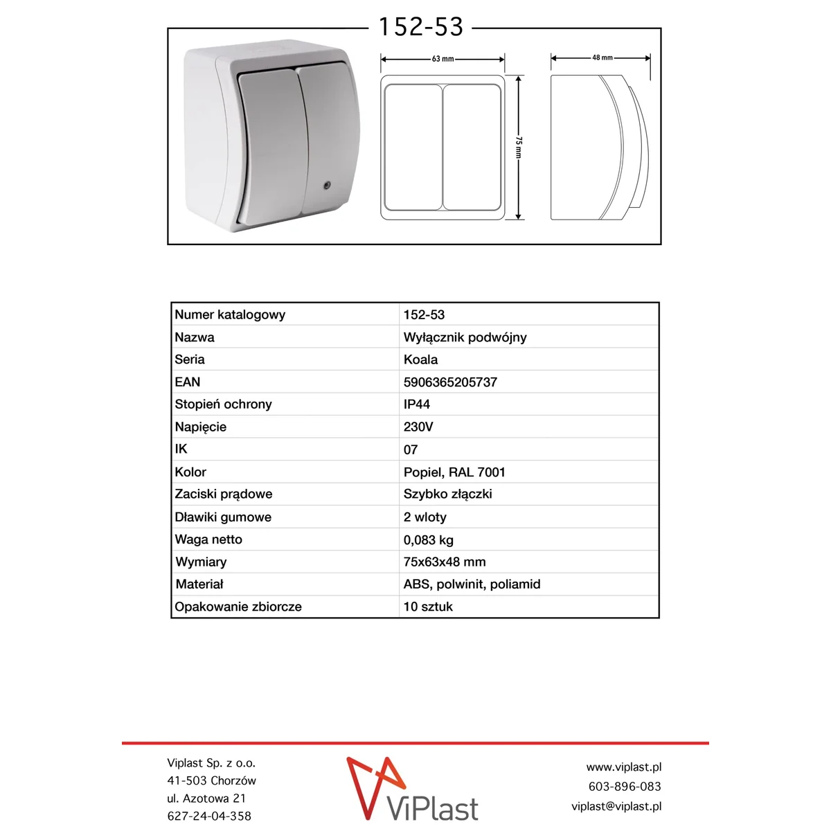 Interruttore a candela illuminato da superficie della serie Koala del produttore ViPlast. Il numero di catalogo del prodotto è 152-53.