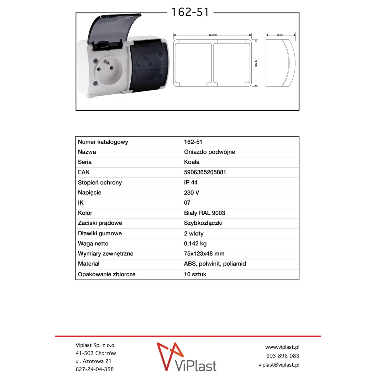 Presa elettrica doppia da parete della serie Koala del produttore ViPlast. Il numero di catalogo del prodotto è 162-51.