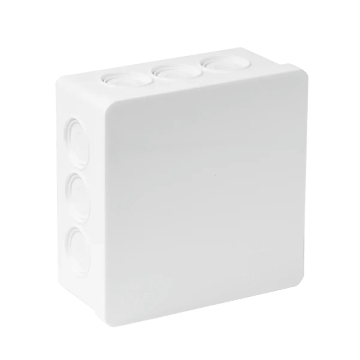 Scatola PF da parete, dimensioni 86x86x40mm, con protezione IP55, 12 ingressi con indebolimento; è possibile utilizzare pressacavi filettati. Con coperchio chiuso con sistema click-clack. In bianco.
