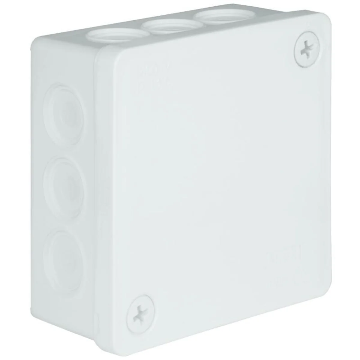 Scatola PF da parete, dimensioni 86x86x40mm, con protezione IP55, 12 ingressi con indebolimento; è possibile utilizzare pressacavi filettati. E' dotato di coperchio con 2 viti. In bianco.