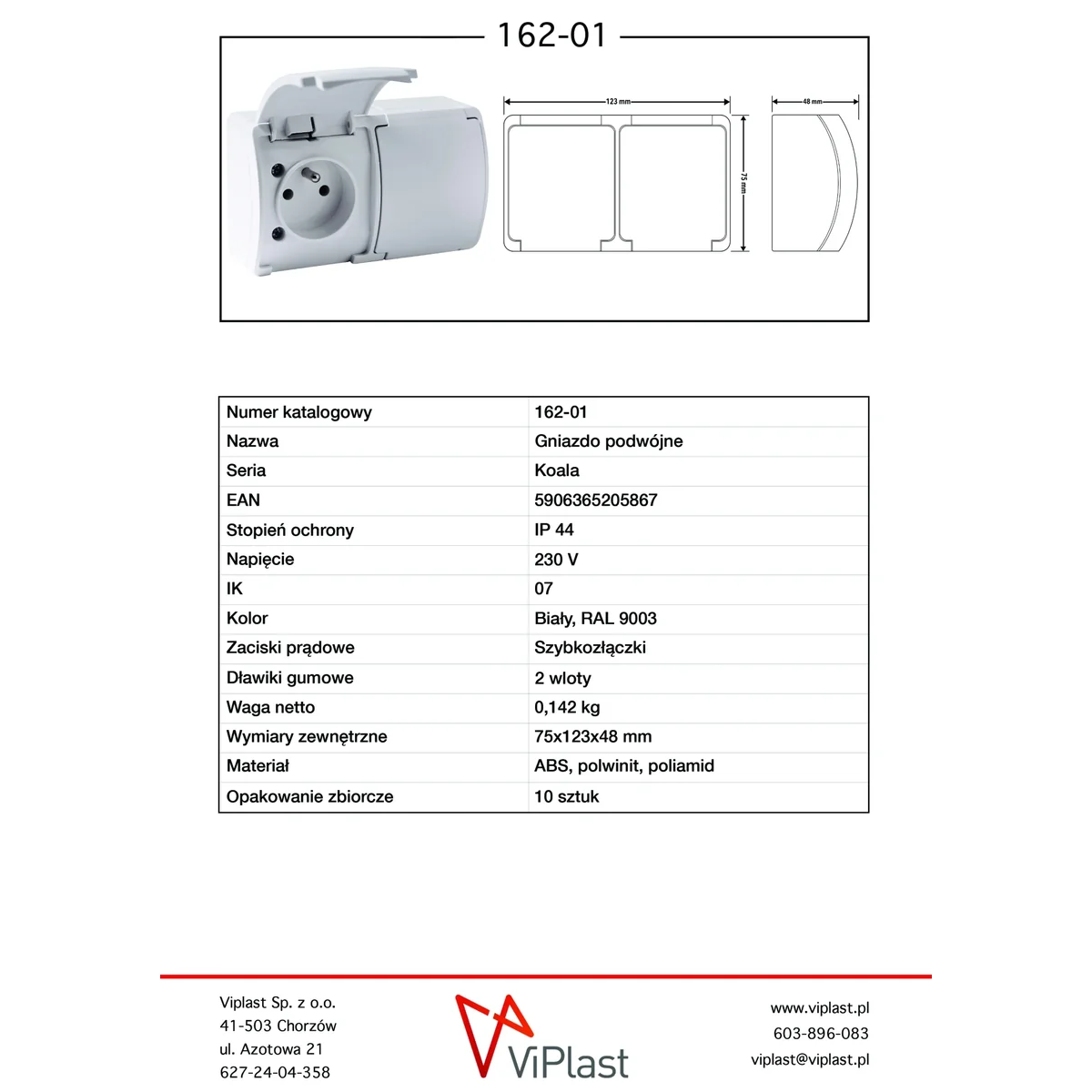 Presa elettrica doppia da parete della serie Koala del produttore ViPlast. Il numero di catalogo del prodotto è 162-01.