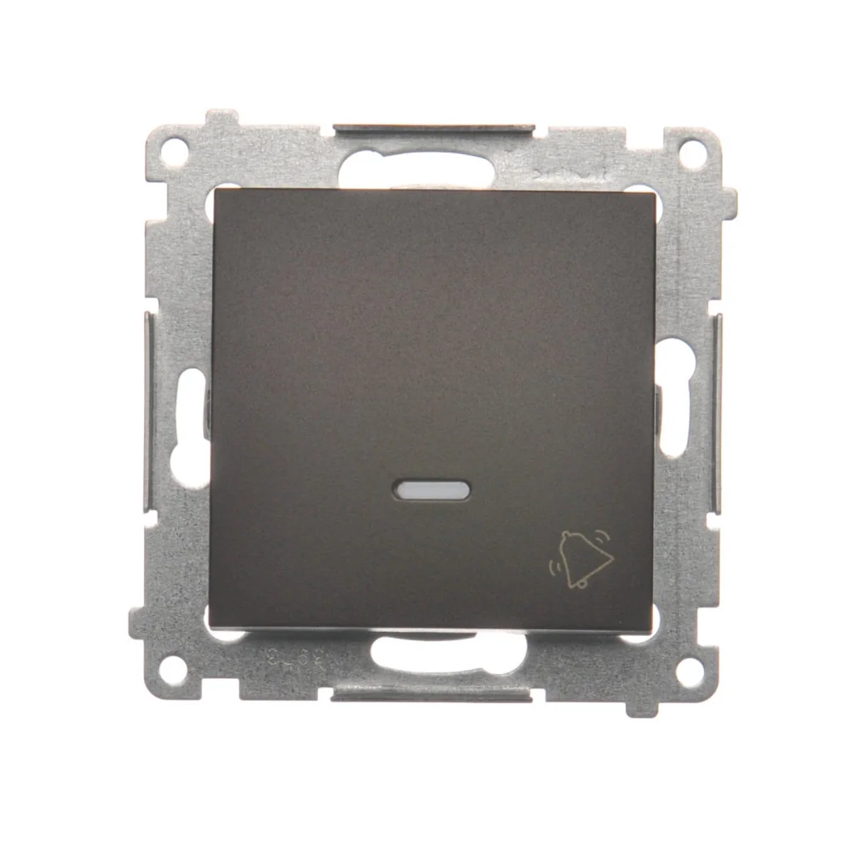 Pulsante "campanello". con retroilluminazione, della serieSimon 54, del produttoreContatta Simon. Il numero di catalogo del prodotto èDD1L.01/46 . Marrone opaco, metallizzato.
